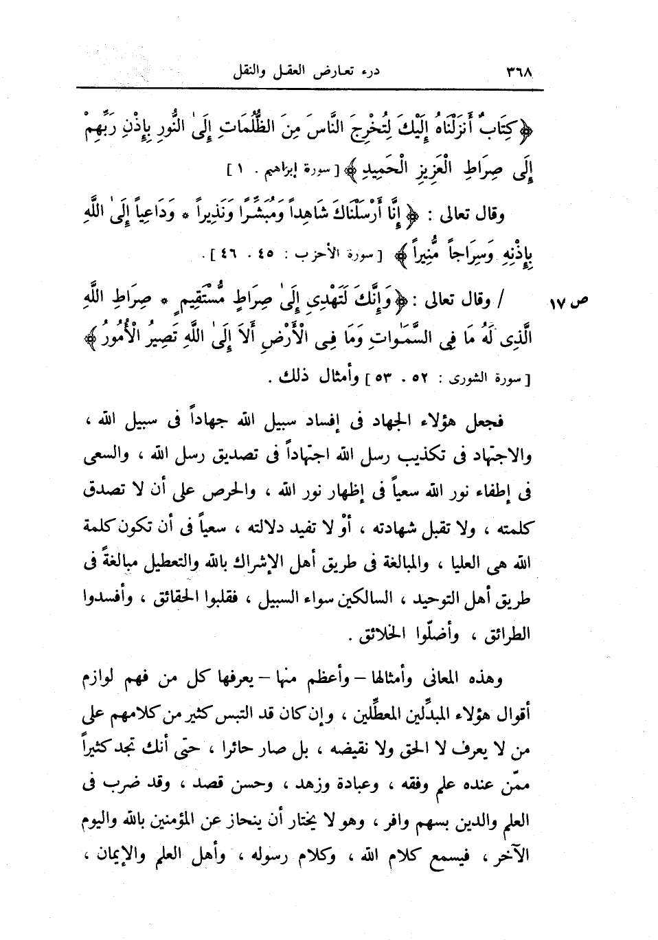 فجعل هؤلاء الجهاد في إفساد سبيل الله جهاداً في سبيل الله، والاجتهاد في تكذيب رسل الله اجتهاداً في تصديق رسل الله، والسعي في إطفاء نور الله سعياً في إظهار نور الله، والحرص على أن لا تصدق كلمته، ولا تقبل شهادته، أو لا تفيد دلالته، سعياً في أن تكون كلمة الله هي العليا، والمبالغة في طريق أهل الإشراك بالله والتعطيل مبالغة في طريق أهل التوحيد، السالكين سواء السبيل، فقلبوا الحقائق، وأفسدوا الطرائق، وأضلوا الخلائق.