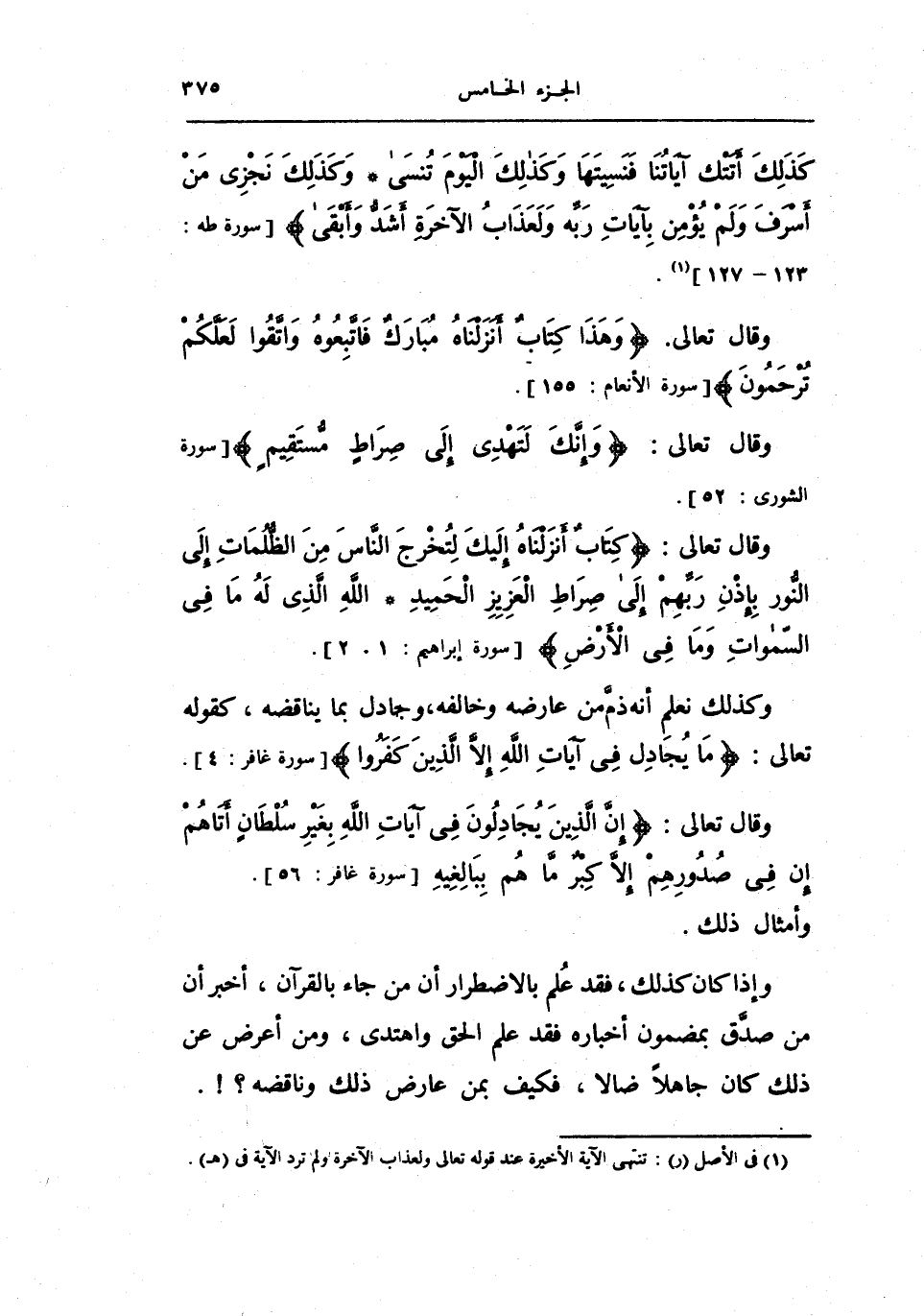 وكذلك نعلم انه ذم من عارضه وخالفه، وجادل بما يناقضه، كقوله تعالى: {ما يجادل في آيات الله إلا الذين كفروا} [غافر: 4] .