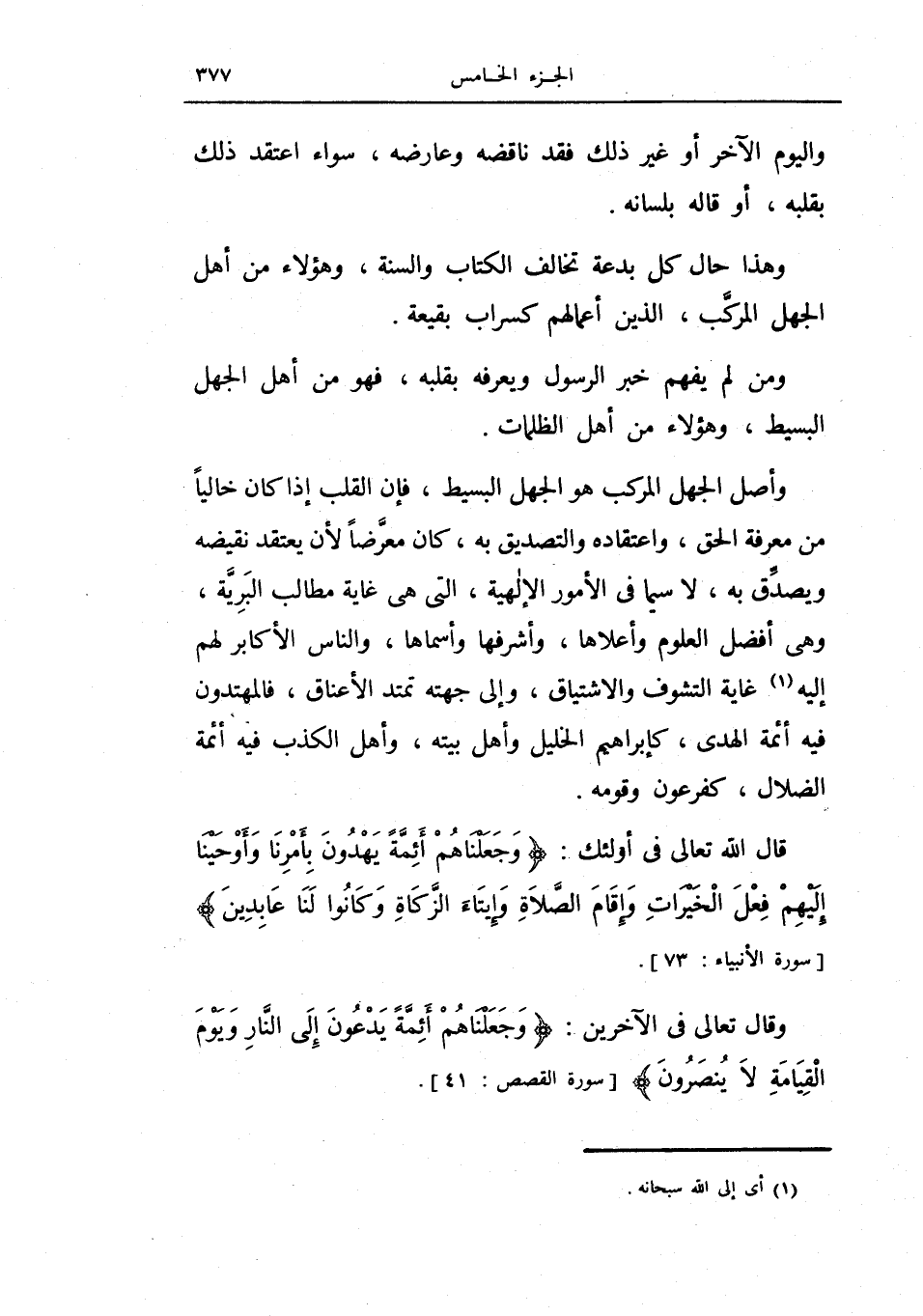 وأصل الجهل المركب هو الجهل البسيط، فإن القلب إذا كان خالياً من معرفة الحق، واعتقاده والتصديق به، كان معرضاً لأن يعتقد نقيضه ويصدق به، لا سيما في الأمور الإلهية، التي هي غاية مطالب البرية، وهي أفضل العلوم وأعلاها، وأشرفها وأسماها، والناس الأكابر لهم إليه غاية التشوف والاشتياق، وإلى جهته تمتد الأعناق، فالمهتدون فيه أئمة الهدى، كإبراهيم الخليل وأهل بيته، وأهل الكذب فيه أئمة الضلال، كفرعون وقومه.