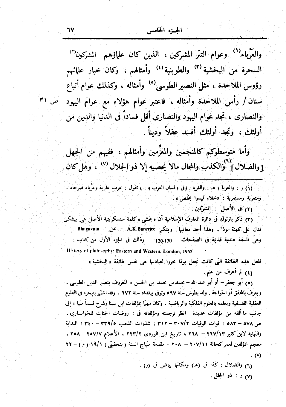 والعرباء وعوام التتر المشركين، الذين كان علماؤهم المشركون السحرة من البخشية والطوينية وأمثالهم، وكان خيار علمائهم رؤوس الملاحدة، فاعتبر عوام هؤلاء مع عوام اليهود والنصارى، تجد عوام اليهود والنصارى أقل فساداً في الدنيا والدين من أولئك، وتجد أولئك أفسد عقلاً وديناً.