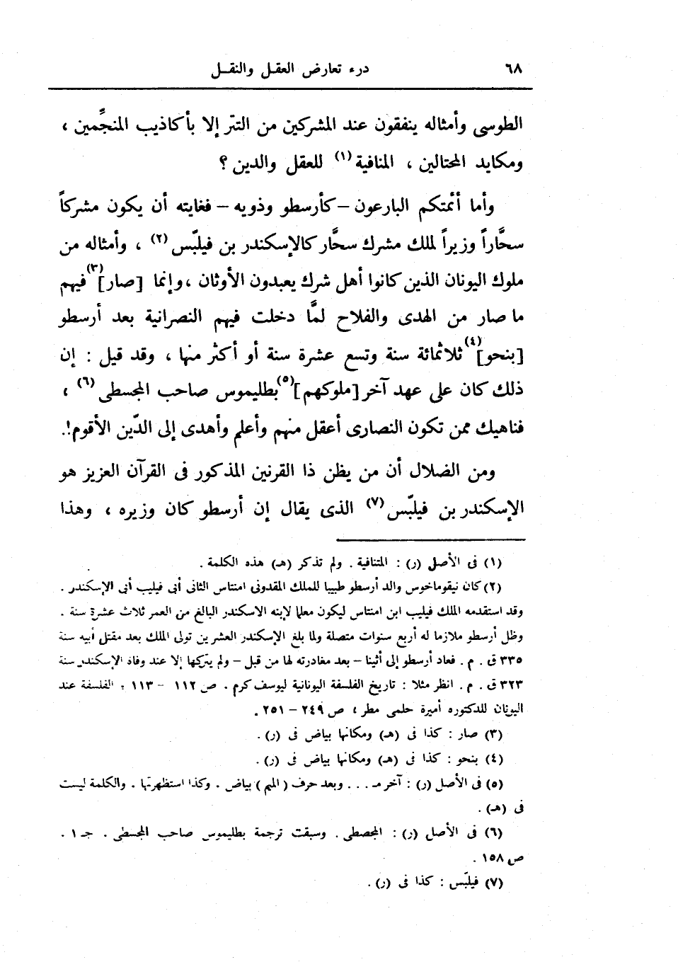 وأما أئمتكم البارعون كأرسطو وذويه فغايته ان يكون مشركاً سحاراً وزيراً لملك مشرك سحار كالإسكندر بن فيلبس وأمثاله من ملوك اليونان الذين كانوا أهل شرك يعبدون الأوثان وإنما صار فيهم ما صار من الهدى والفلاح لما دخلت فيهم النصرانية بعد أرسطو بنحو ثلاثمائة سنة وتسع وعشرة سنة او اكثر منها وقد قيل إن ذلك كان على عهد آخر ملوكهم بطليموس صاحب المجسطي، فناهيك ممن تكون النصارى أعقل منهم وأعلم وأهدى إلى الدين الأقوم.