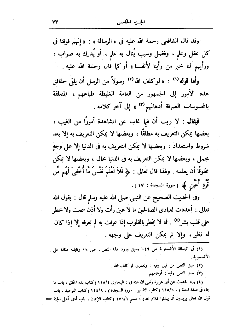 وفي الحديث الصحيح عن النبي صلى الله عليه وسلم قال: يقول الله تعالى أعددت لعبادي الصالحين مالا عين رأت ولا أذن سمعت ولا خطر على قلب بشر فما لا يخطر بالقلوب إذا عرفت به لم تعرفه إلا إذا كان له نظير، وإلا لم يمكن التعريف على وجهه.