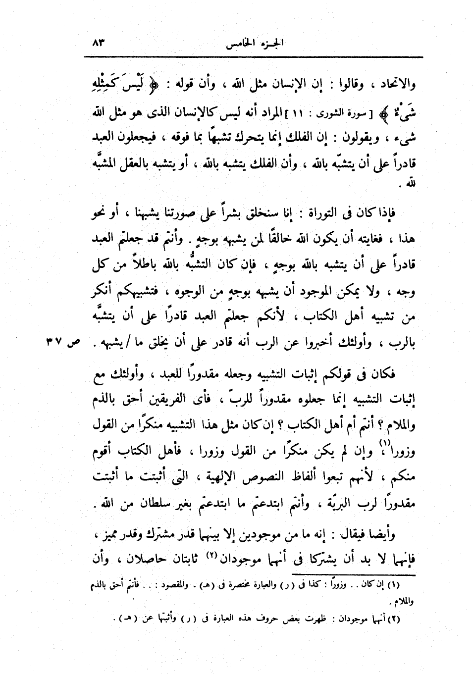 فإذا كان في التوراة: أنا سنخلق بشراً على صورتنا يشبهنا، أو نحو هذا فغايته أن يكون الله خالقاً لمن يشبهه بوجه وأنتم قد جعلتم العبد قادراً على أن يتشبه بالله بوجه، فإن كان التشبه بالله باطلاً من كل وجه، ولا يمكن الموجود أن يشبهه بوجه من الوجوه، فتشبيهكم أنكر من تشبيه أهل الكتاب، لأنكم جعلتم العبد قادراً على ان يتشبه بالرب وأولئك أخبروا عن الرب أنه قادر على أن يخلق ما يشبهه.
