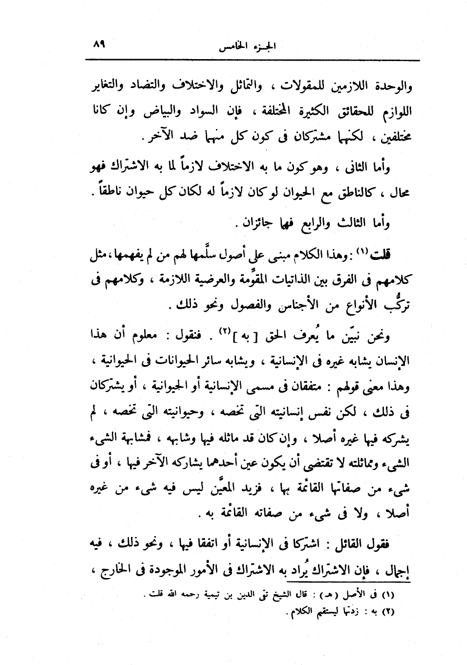 قلت: وهذا الكلام مبني على أصول سلمها لهم من لم يفهمها، مثل كلامهم في الفرق بين الذاتيات المقومة والعرضية اللازمة، وكلامهم في تركب الأنواع من الأجناس والفصول ونحو ذلك.