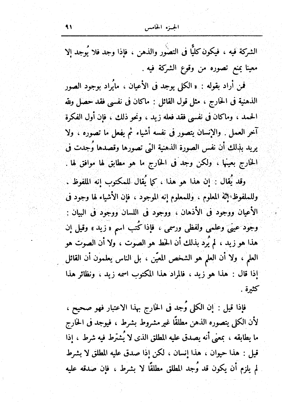 فإذا قيل: إن الكلي وجد في الخارج بهذا الاعتبار فهو صحيح، لأن الكلي يتصوره الذهن مطلقاً غير مشروط بشرط، فيوجد في الخارج ما يطابقه، بمعنى انه يصدق عليه المطلق الذي لا يشترط فيه شرط، فيوجد في الخارج ما يطابقه، بمعنى انه يصدق عليه المطلق الذي لا يشترط فيه شرط، إذا قيل: هذا حيوان، هذا إنسان، لكن إذا صدق عليه المطلق لا بشرط لم يلزم أن يكون قد وجد المطلق مطلقاً لا بشرط، فإن صدقه عليه