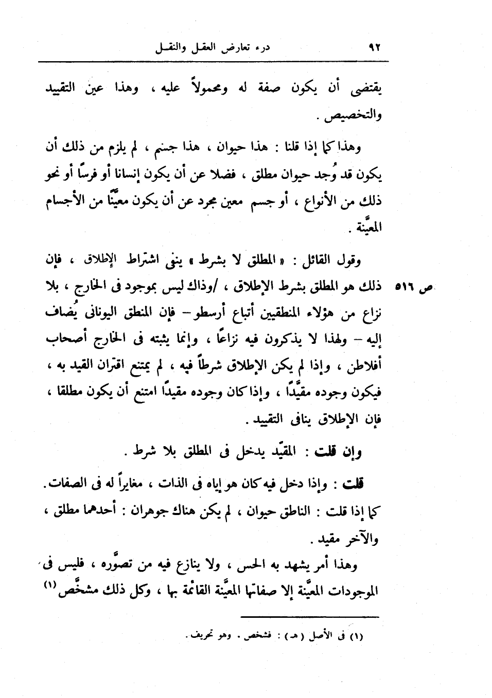 وقول القائل: المطلق لا بشرط ينفي اشتراط الإطلاق، فإن ذلك هو المطلق بشرط الإطلاق، وذاك ليس بموجود في الخارج، بلا نزاع من هؤلاء المنطقيين أتباع أرسطو فإن المنطق اليوناني يضاف إليه ولهذا لا يذكرون فيه نزاعاً وإنما يثبته في الخارج أصحاب أفلاطون، وإذا لم يكن الإطلاق شرطاً فيه، لم يمتنع اقتران القيد به، فيكون وجوده مقيداً، وإذا كان وجوده مقيداً امتنع أن يكون مطلقاً فإن الإطلاق ينافي التقييد.
