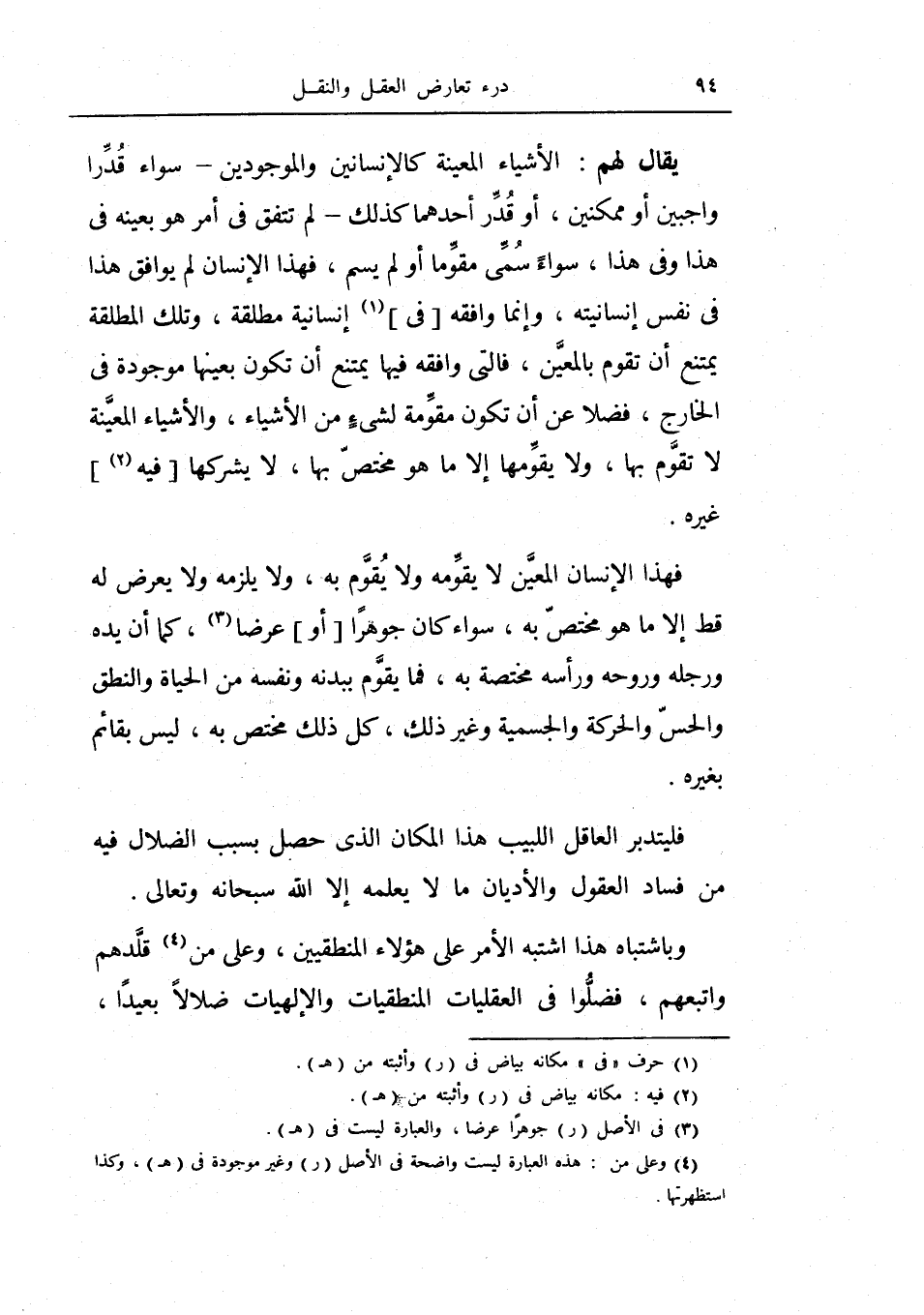 يقال لهم: الأشياء المعينة كالإنسانيين والموجودين سواء قدرا واجبين أو ممكنين أو قدر أحدهما كذلك لم تتفق في أمر هو بعينه في هذا وفي هذا، سواء سمي مقوماً أو لم يسم، فهذا الإنسان لم يوافق هذا في نفس إنسانيته، وإنما وافقه في إنسانية مطلقة، وتلك المطلقة يمتنع أن تقوم بالمعين، فالتي وافقه فيها يمتنع أن تكون بعينها موجودة في الخارج، فضلا عن أن تكون مقومة لشيء من الأشياء والأشياء المعينة لا تقوم بها، ولا يقومها إلا ما هو مختص بها، لا يشركها فيه غيره.