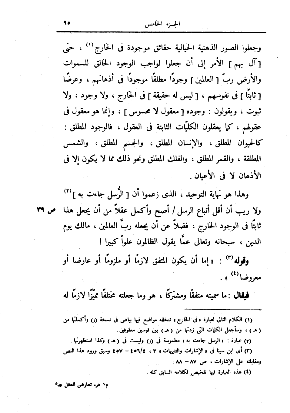 وجعلوا الصور الذهنية الخيالية حقائق موجودة في الخارج، حتى آل بهم الأمر إلى أن جعلوا لواجب الوجود الخالق للسماوات والأرض رب العالمين وجوداً مطلقاً في إذ انهم، وعرضا ثابتاً في نفوسهم، ليس له حقيقة في الخارج، ولا وجود، ولا ثبوت ويقولون: وجوده معقول لا محسوس، وإنما هو معقول في عقولهم، كما يعقلون الكليات الثابتة في العقول، فالوجود المطلق: كالحيوان المطلق، والإنسان والجسم المطلق، والشمس المطلقة، والقمر المطلق، والفالك المطلق ونحو ذلك مما لا يكون إلا في الأذهان لا في الأعيان.