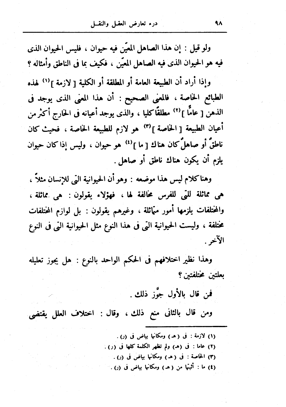 وهنا كلام ليس هذا موضعه وهو أن الحيوانية التي للإنسان مثلاً، هي مماثلة للتي للفرس مخالفة لها، فهؤلاء يقولون: هي مماثلة والمختلفات يلزمها امور متماثلة، وغيرهم يقولون: بل لوازم المختلفات مختلفة، وليست الحيوانية التي في هذا النوع مثل الحيوانية التي في النوع الآخر.