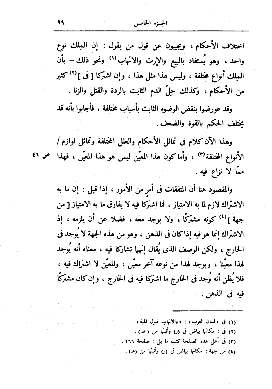 والمقصود هنا أن المتفقات في أنر من الأمور، إذا قيل: إن ما به الاشتراك لازم لما به الامتياز فما اشتركا فيه لا يفارق ما به من الامتياز من جهة كونه مشتركا ولا يوجد معه، فضلا عن أن يلزمه، إذ الاشتراك إنما هو فيه إذا كان في الذهن، وهو من هذه الجهة لا يوجد في الخارج، ولكن الوصف الذي يقال إنهما تشاركا فيه، معناه انه يوجد لهذا معينا، ويوجد لهذا من نوعه آخر معين والمعين لا اشتراك فيه، فلا يظن انه وجد في الخارج ما اشتركا فيه في الخارج، وإن كان مشتركا فيه في الذهن.
