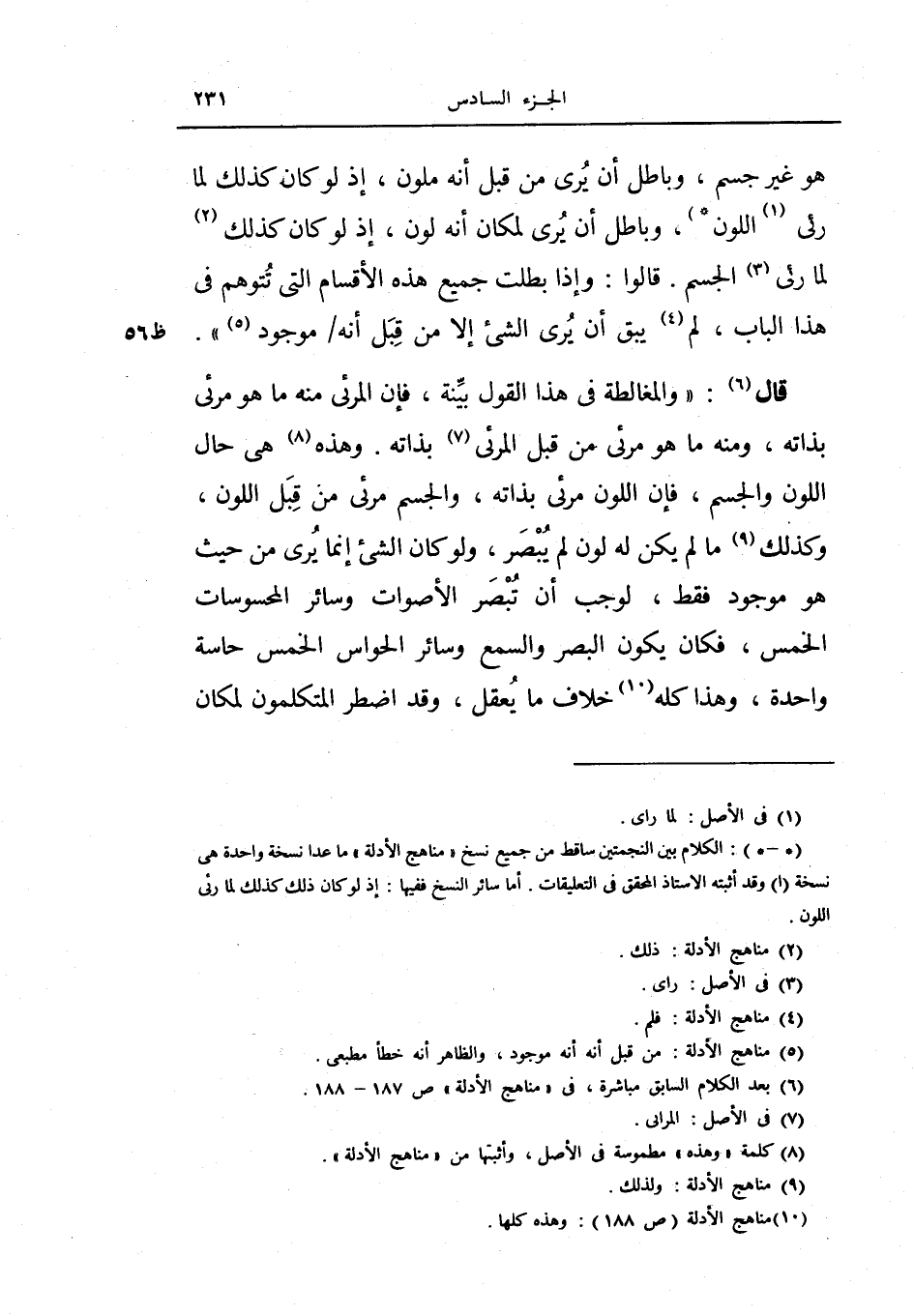 وهذه هي حال اللون والجسم، فإن اللون مرئي بذاته، والجسم مرئي من قبل اللون، وكذلك ما لم يكن له لون لم يبصر، ولو كان الشيء إنما يرى من حيث هو موجود فقط، لوجب أن يبصر الأصوات وسائر المحسوسات الخمس، فكان يكون السمع والبصر وسائر الحواس الخمس حاسة واحدة، وهذا كله خلاف ما يعقل، وقد اضطر المتكلمون لمكان