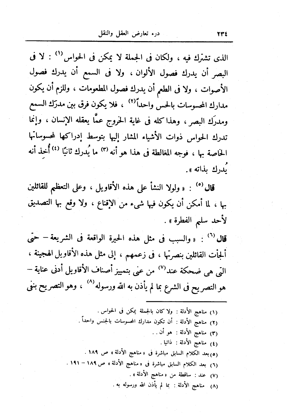 الذي تشترك فيه، ولكان في الجملة لا يمكن في الحواس: لا في البصر أن يدرك فصول الألوان، ولا في السمع أن يدرك فصول الأصوات، ولا في الطعم أن يدرك فصول المطعومات، وللزم أن يكون مدارك المحسوسات بالحس واحداً، فلا يكون فرق بين مدرك السمع ومدرك البصر، وهذا كله في غاية الخروج عما يعقله الإنسان، وإنما تدرك الحواس وذوات الأشياء المشار إليها بتوسط إدراكها لمحسوساتها الخاصة بها، فوجه المغالطة في هذا هو أنه ما يدرك ثانياً أخذ أنه يدرك بذاته) .