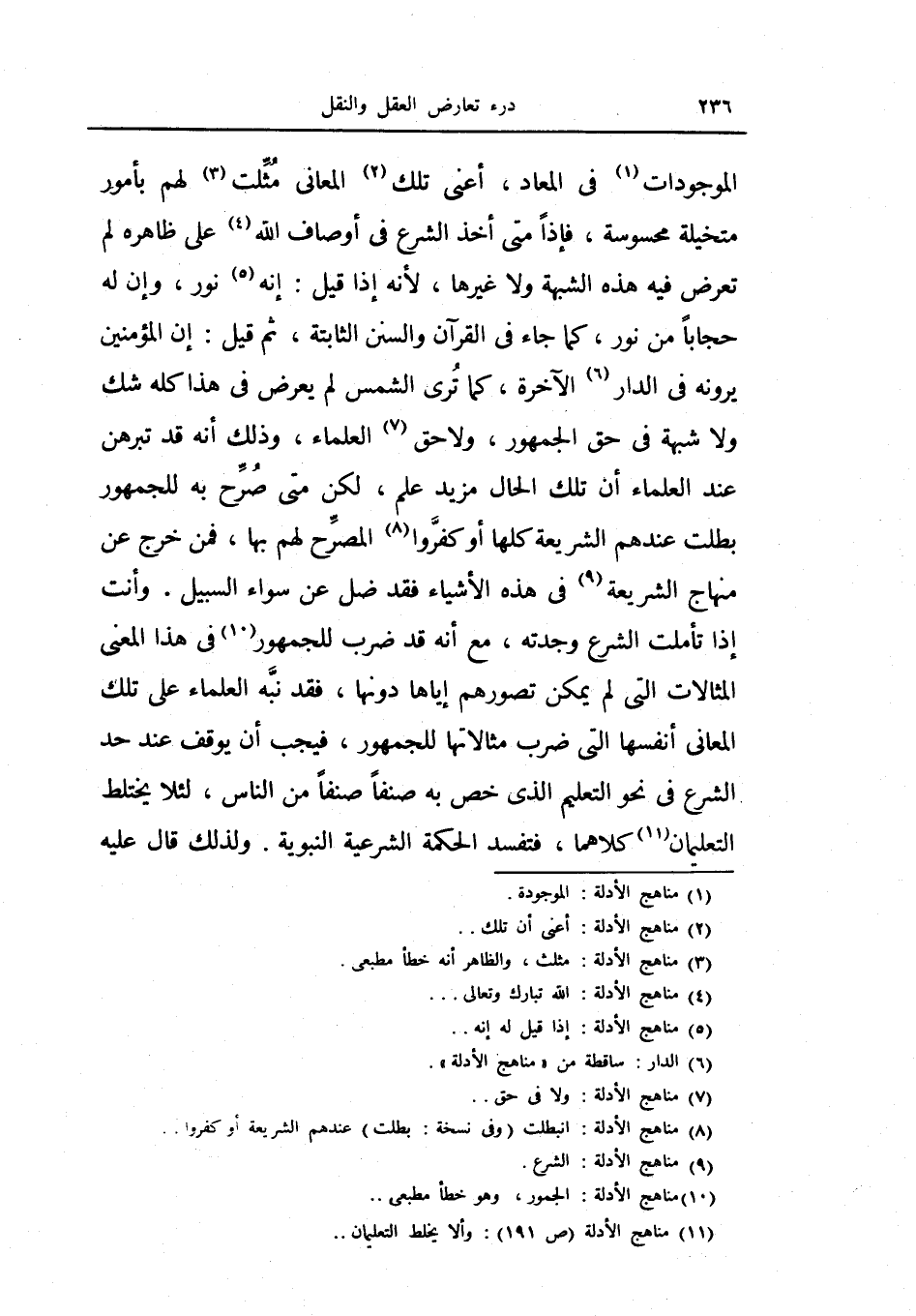 الموجودات في المعاد، أعني تلك المعاني مثلت لهم بأمور متخيلة محسوسة، فإذاً متى أخذ الشرع في أوصاف الله على ظاهره لم تعرض فيه هذه الشبهة ولا غيرها، لأنه إذا قيل: إنه نور، وإن له حجاباً من نور، كما جاء في القرآن والسنن الثابتة، ثم قيل: إن المؤمنين يرونه في الدار الآخرة، كما ترى الشمس لم يعرض في هذا كله شك، ولا شبهة في حق الجمهور، ولا حق العلماء، وذلك أنه قد تبرهن عند العلماء أن تلك الحال مزيد علم، لكن متى صرح به للجمهور بطلت عندهم الشريعة كلها أو كفروا المصرح لهم بها، فمن خرج عن منهاج الشريعة في هذه الأشياء فقد ضل عن سواء السبيل.