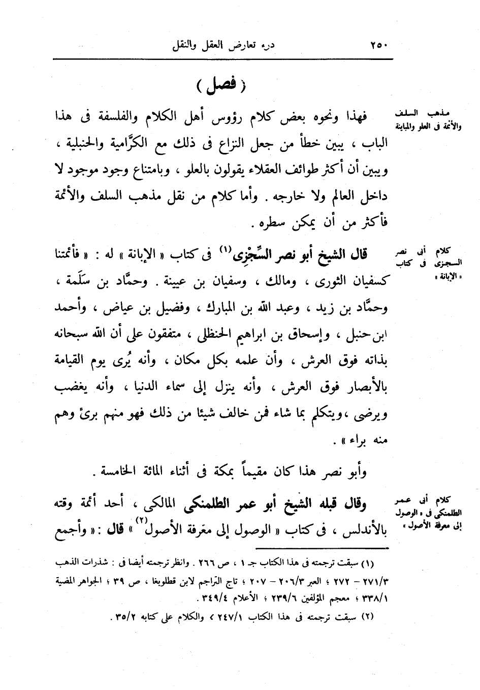 قال الشيخ أبو نصر السجزي في كتاب الإبانة له: فأئمتنا كسفيان الثوري، مالك، سفيان بن عيينة، حماد بن سلامة، حماد بن زيد، عبد الله بن المبارك، فضيل بن عياض، أحمد بن حنبل، إسحق بن إبراهيم الحنظلي، متفقون على أن الله سبحانه بذاته فوق العرش، وأن علمه بكل مكان، وأنه يرى يوم القيامة بالأبصار فوق العرش، وإنه ينزل إلى سماء الدنيا، وأنه يغضب ويرضى، ويتكلم بما شاء فمن خالف شيئاً من ذلك فهو منهم بريء وهم منه براء.