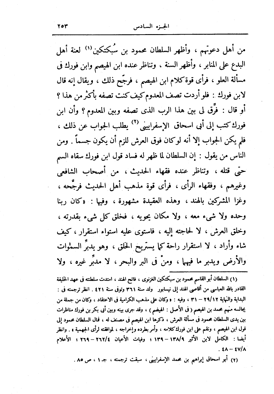من أهل دعوتهم، وأظهر السلطان محمود بن سبكتكين لعنة أهل البدع على المنابر، وأظهر السنة، وتناظر عنده ابن الهيصم وابن فورك في مسألة العلو، فرأى قوة كلام ابن الهيصم، فرجح ذلك، ويقال إنه قال لابن فورك: فلو أردت تصف المعدوم كيف كنت تصفه بأكثر من هذا؟ أو قال: فرق لي بين هذا الرب الذي تصفه وبين المعدوم؟ وأن ابن فورك كتب إلى أبي إسحق الأسفراييني يطلب الجواب عن ذلك، فلم يكن الجواب إلا أنه لو كان فوق العرش للزم أن يكون جسماً.