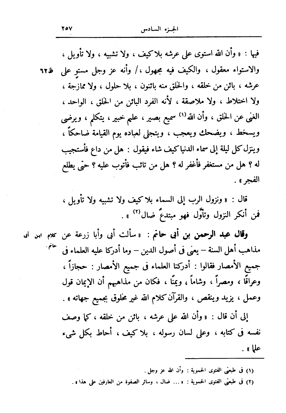 وقال عبد الرحمن بن أبي حاتم: (سألت أبي وأبا زرعة عن مذاهب أهل السنة يعني في أصول الدين - وما أدركا عليه العلماء في جميع الأمصار فقالوا: أدركنا العلماء في جميع الأمصار حجازاً، وعراقاً، ومصراً وشاماً، ويمناً فكان من مذاهبهم أن الإيمان قول وعمل، يزيد وينقص، والقرآن كلام الله غير مخلوق بجميع جهاته) .