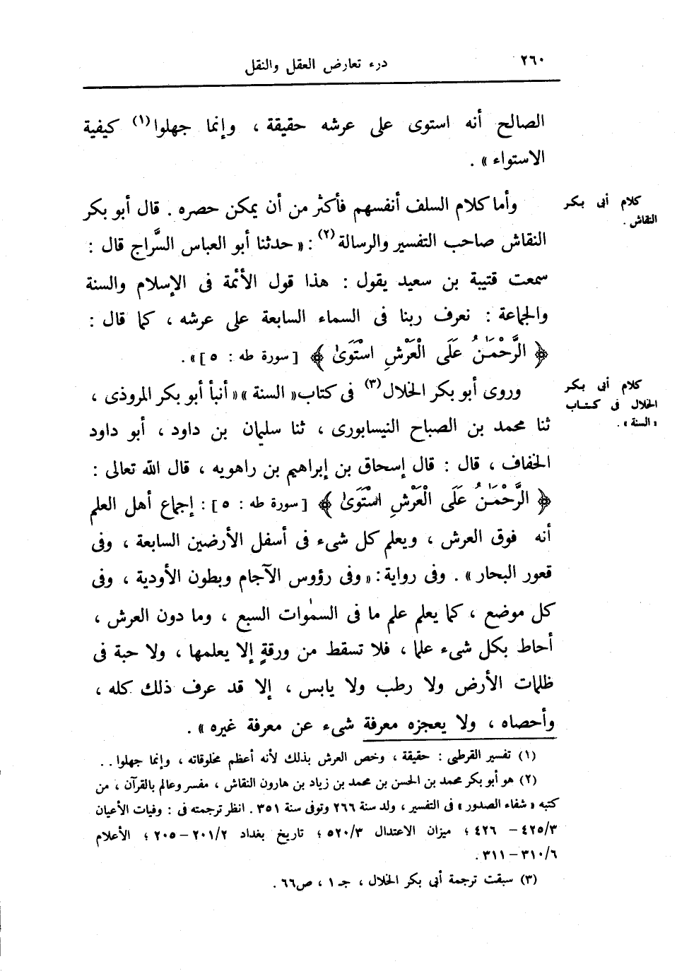 قال أبو بكر النقاش صاحب التفسير والرسالة: (حدثنا أبو العباس السراج قال: سمعت قتيبة بن سعيد يقول: هذا قول الأئمة في الإسلام والسنة والجماعة: نعرف ربنا في السماء السابعة على عرشه، كما قال: {الرحمن على العرش استوى} [طه: 5] .