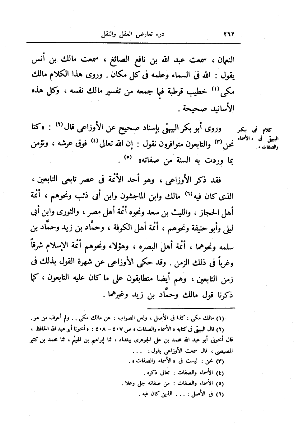 وروى أبو بكر البيهقي بإسناد صحيح عن الأوزاعي قال: (كنا نحن والتابعون متوافرون نقول: إن الله تعالى فوق العرش، ونؤمن بما وردت به السنة من صفاته) .