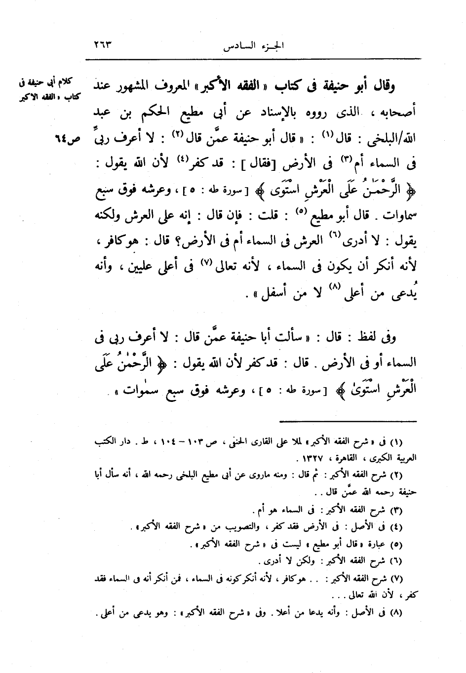 وقال أبو حنيفة في كتاب الفقه الأكبر المعروف المشهور عند أصحابه، الذي رووه بالإسناد عن أبي مطيع الحكم بن عبد الله البلخي قال: قال أبو حنيفة عمن قال: لا أعرف ربي في السماء أم في الأرض فقال: قد كفر لأن الله يقول: {الرحمن على العرش استوى} [طه: 5] ، وعرشه فوق سبع سماوات.