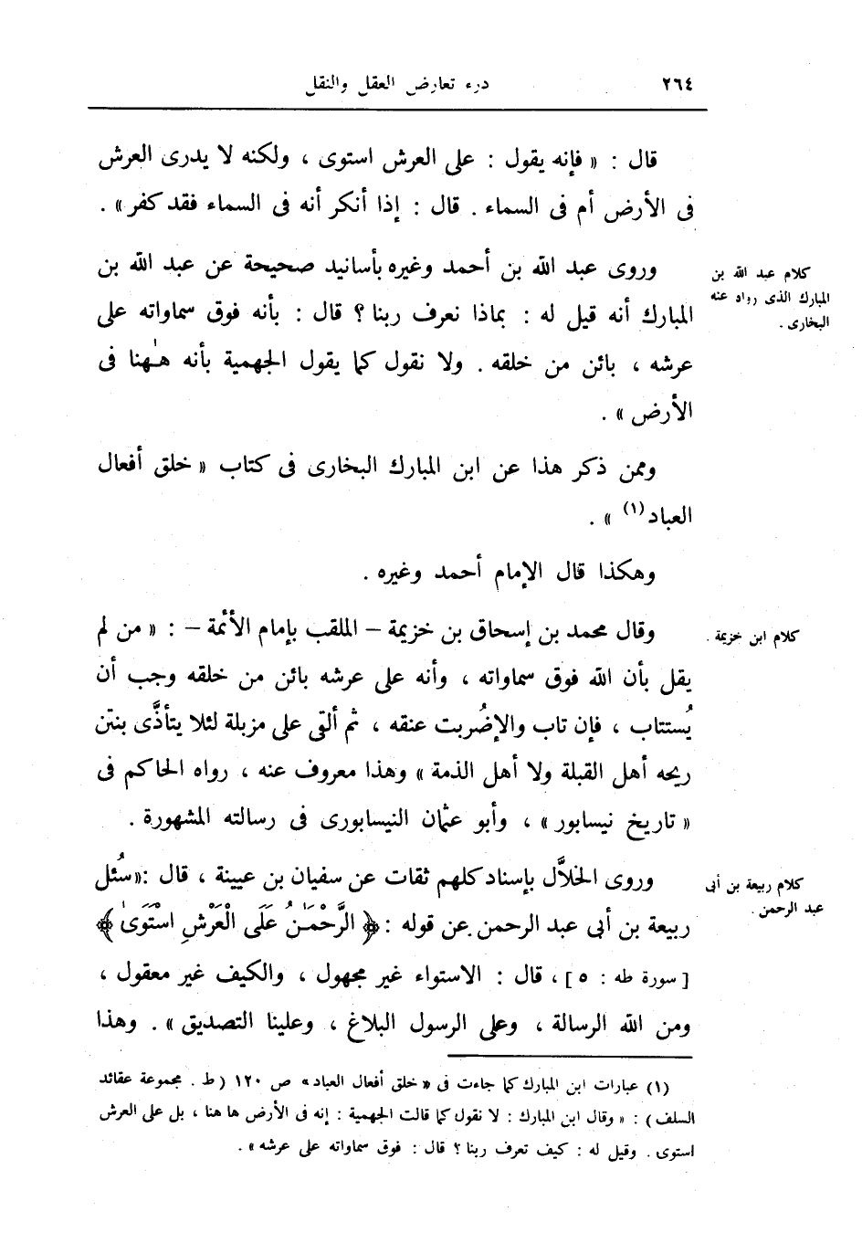 وروى الخلال بإسناد كلهم ثقات عن سفيان بن عيينة، قال: (سئل ربيعة بن أبي عبد الرحمن عن قوله: {الرحمن على العرش استوى} [طه: 5] ، قال: الاستواء غير مجهول، والكيف غير معقول، ومن الله الرسالة، وعلى الرسول البلاغ، وعلينا التصديق) .