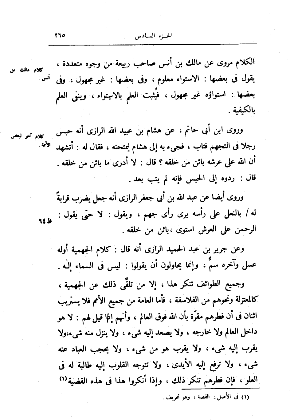 وروى ابن أبي حاتم، عن هشام بن عبيد الله الرازي أنه حبس رجلاً في التجهم فتاب، فجيء به إلى هشام ليمتحنه، فقال له: أتشهد أن الله على عرشه بائن من خلقه؟ قال: لا أدري ما بائن من خلقه.