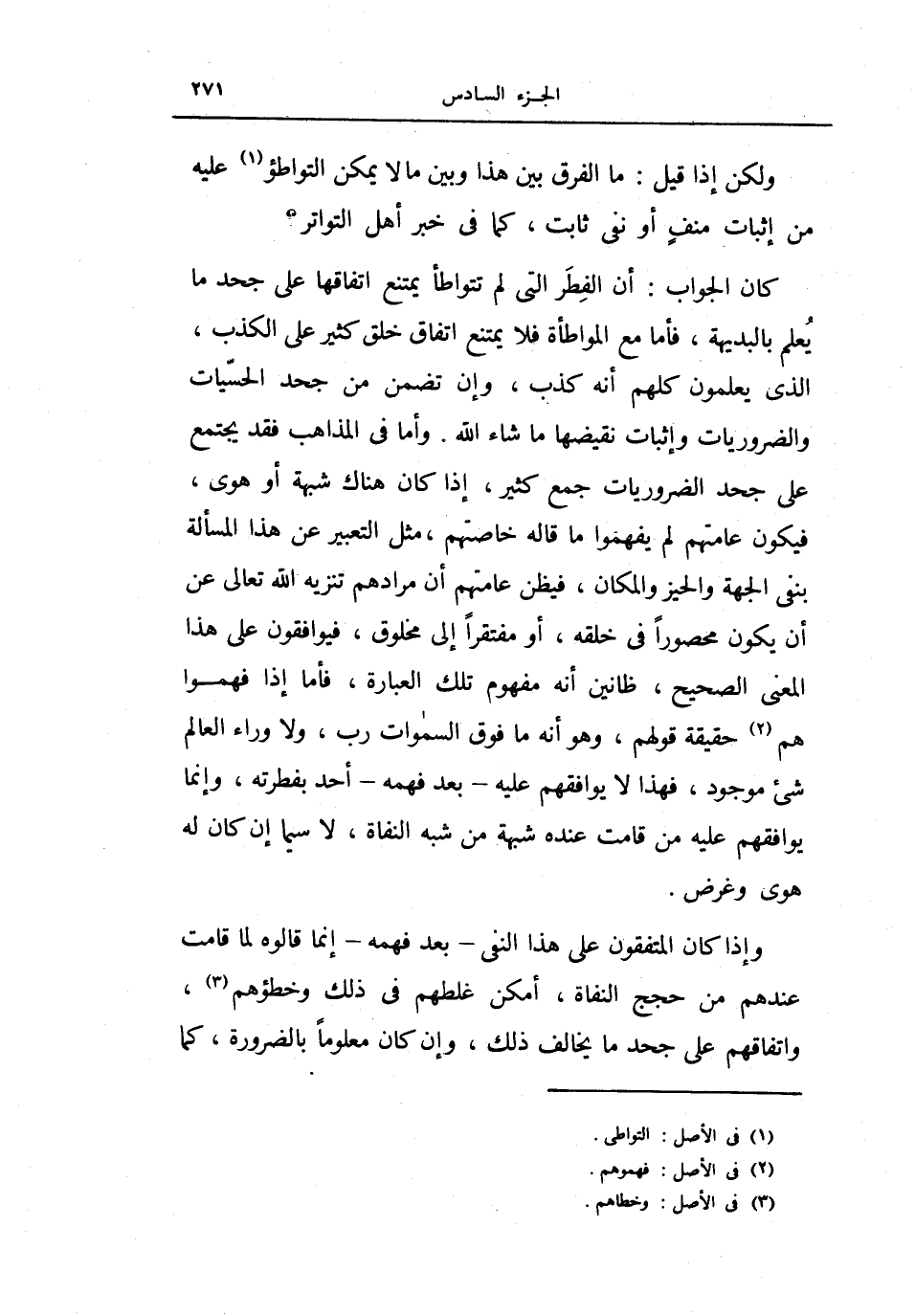 وأما في المذاهب فقد يجتمع على جحد الضروريات جمع كثير، إذا كان هناك شبهة أو هوى، فيكون عامتهم لم يفهموا ما قاله خاصتهم، مثل التعبير عن هذه المسألة بنفي الجهة والحيز والمكان، فيظن عامتهم أن مرادهم تنزيه الله تعالى عن أن يكون محصوراً في خلقه، أو مفتقراً إلى مخلوق، فيوافقون على هذا المعنى الصحيح، ظانين أنه مفهوم تلك العبارة، فأما إذا فهموا هم حقيقة قولهم، وهو أنه ما فوق السماوات رب، ولا وراء العالم شيء موجود، فهذا لا يوافقهم عليه - بعد - فهمه - أحد بفطرته، وإنما يوافقهم عليه من قامت عنده شبهة من شبه النفاة، لا سيما إن كان له هوى وغرض.
