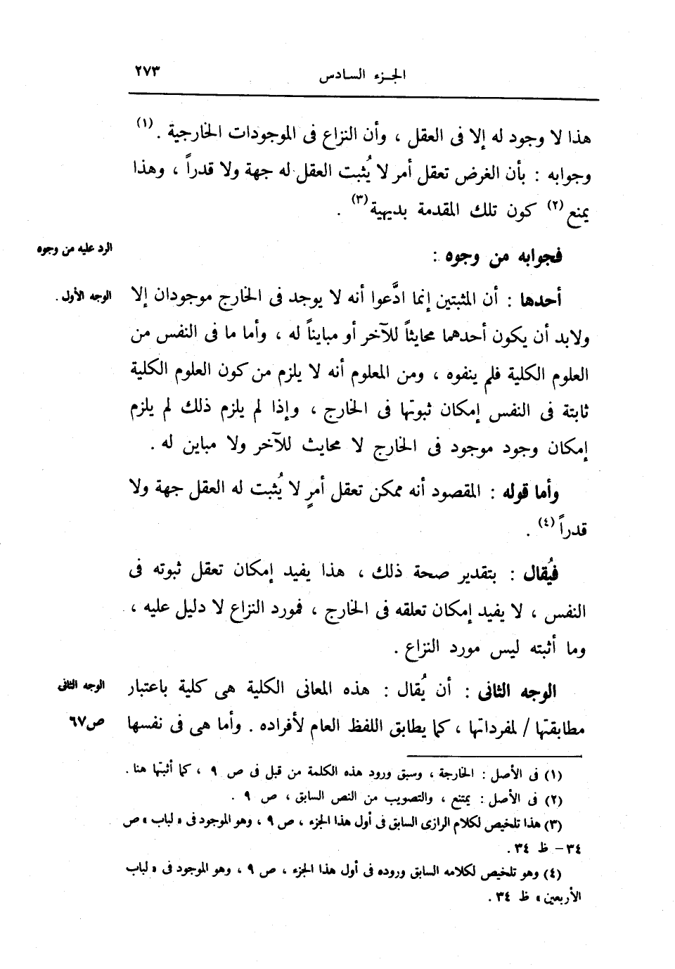 أن المثبتين إنما ادعوا أنه لا يوجد في الخارج موجودان إلا ولا بد أن يكون أحدهما محايثاً للآخر أو مبايناً له، وأما ما في النفس من العلوم الكلية فلم ينفوه، ومن المعلوم أنه لا يلزم من كون العلوم الكلية ثابتة في النفس إمكان ثبوتها في الخارج، وإذا لم يلزم ذلك لم يلزم إمكان وجود موجود في الخارج لا محايث للاخر ولا مباين له.