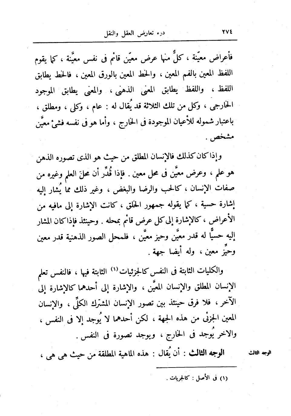 والكليات ثابتة في النفس كالجزئيات الثابتة فيها، فالنفس تعلم الإنسان المطلق والإنسان المعين، والإشارة إلى أحدهما كالإشارة إلى الآخر، فلا فرق حينئذ بين تصور الإنسان المشترك الكلي، والإنسان المعين الجزئي من هذه الجهة، لكن أحدهما لا يوجد إلا في النفس والآخر يوجد في الخارج، ويوجد تصوره في النفس.