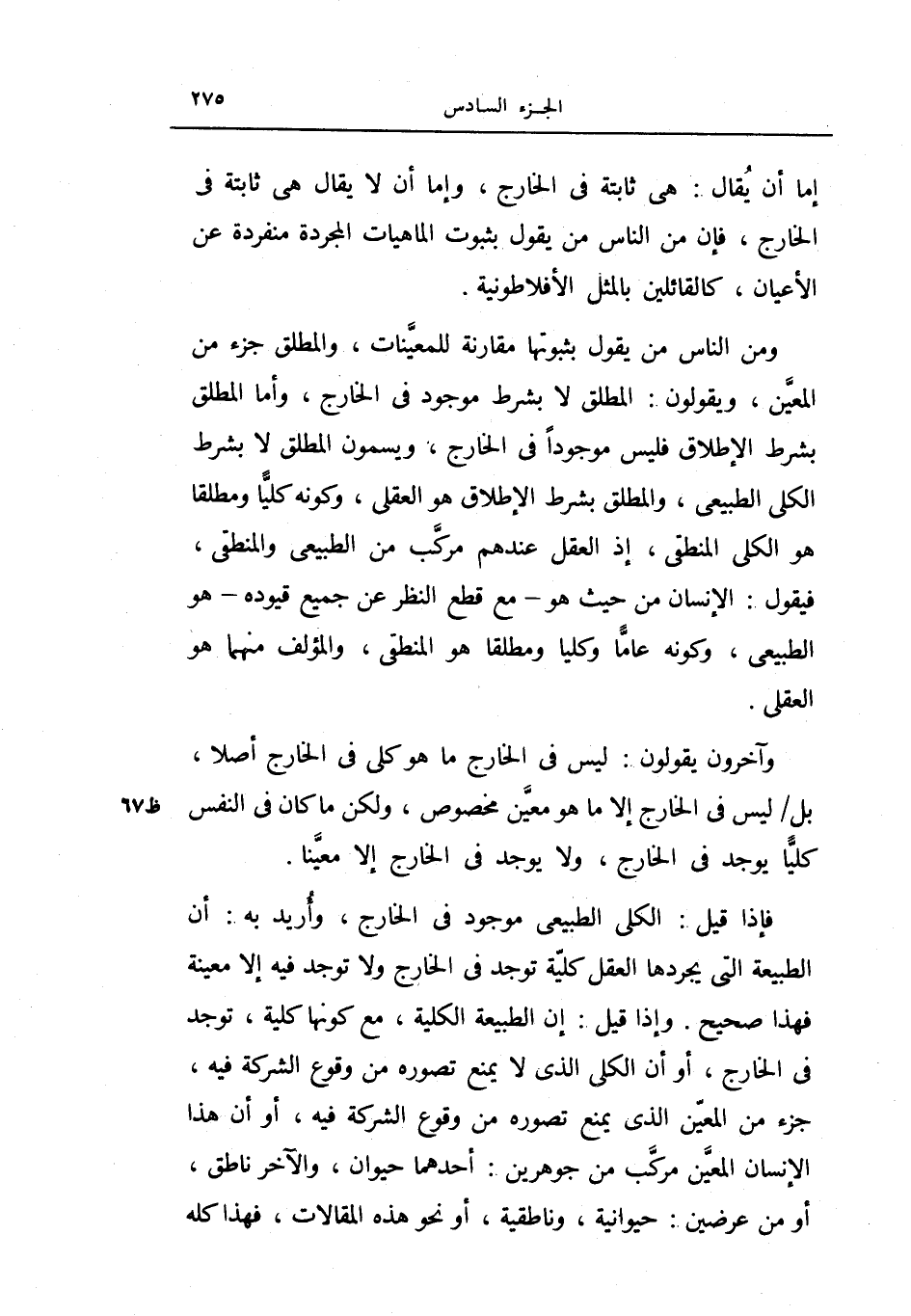 وإذا قيل: إن الطبيعة الكلية، مع كونها كلية، توجد في الخارج، أو أن الكلي الذي لا يمنع تصوره من وقوع الشركة فيه، جزء من المعين الذي يمنع تصوره من وقوع الشركة فيه، أو أن هذا الإنسان المعين مركب من جوهرين: أحدهما حيوان والآخر ناطق، أو من عرضين: حيوانية وناطقية، أو نحو هذه المقالات، فهذا كله