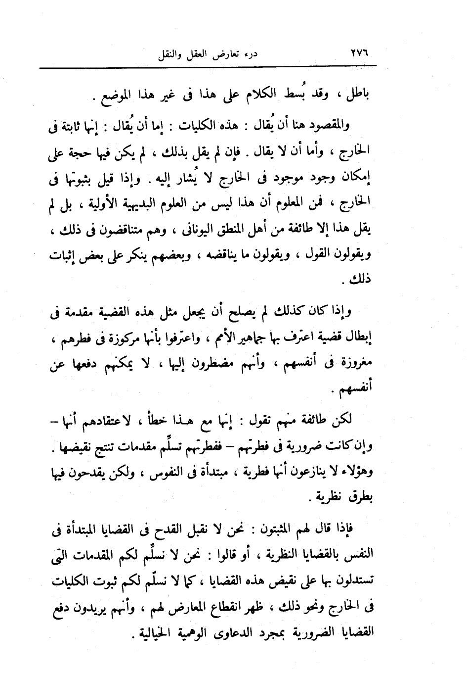 فإذا قال لهم المثبتون: نحن لا نقبل القدح في القضايا المبتدأة في النفس بالقضايا النظرية، أو قالوا: نحن لا نسلم لكم المقدمات التي تستدلون بها على نقيض هذه القضايا، كما لا نسلم لكم ثبوت الكليات في الخارج ونحو ذلك، ظهر انقطاع المعارض لهم، وأنهم يريدون دفع القضايا الضرورية بمجرد الدعاوى الوهمية الخيالية.