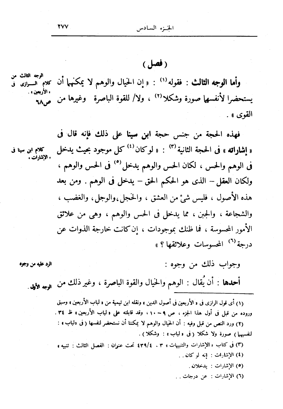 وأما الوجه الثالث: فقوله (إن الخيال والوهم لا يمكنهما أن يستحصرا لأنفسهما صورة وشكلاً، ولا للقوة الباصرة وغيرها من القوى) .