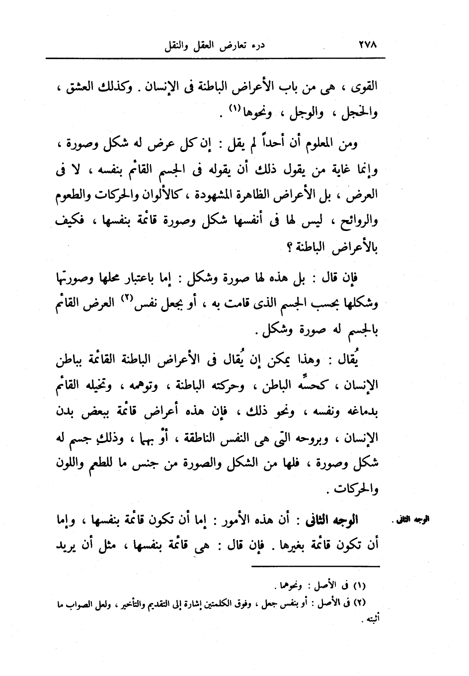 يقال: وهذا يمكن أن يقال في الأعراض الباطنة القائمة بباطن الإنسان، كحسه الباطن، وحركته الباطنة، وتوهمه، وتخيله القائم بدماغه ونفسه، ونحو ذلك فإن هذه أعراض قائمة ببعض بدن الإنسان، وبروحه التي هي النفس الناطقة، أو بهما، وذلك جسم له شكل وصورة، فلها من الشكل والصورة من جنس ما للطعم واللون والحركات.