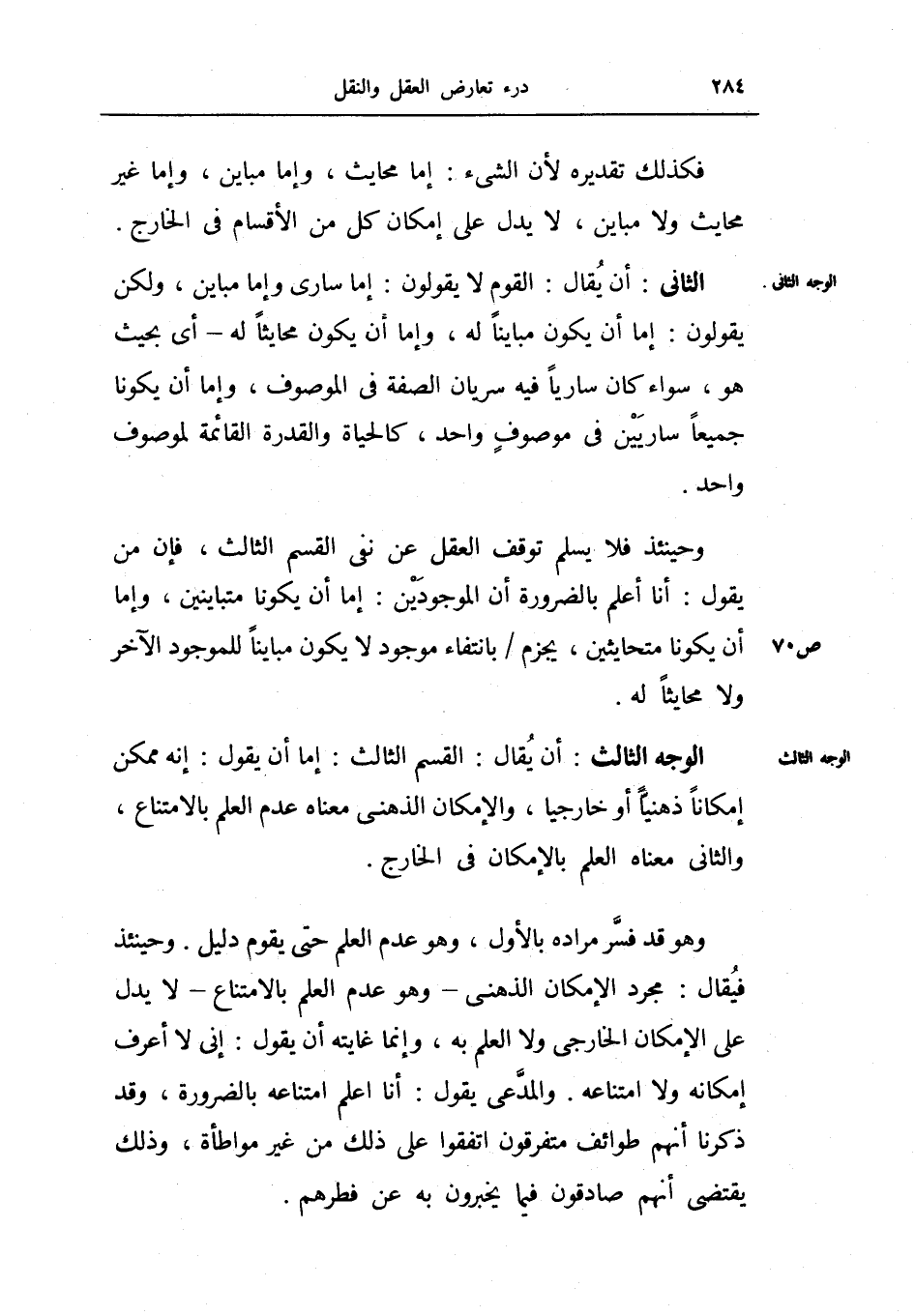 أن يقال: القوم لا يقولون: إما ساري وإما مباين، ولكن يقولون: إما أن يكون مبايناً له، وإما أن يكون محايثاً له - أي بحيث هو، سواء كان سارياً فيه سريان الصفة في الموصوف، وإما أن يكون جميعاً ساريين في موصوف واحد، كالحياة والقدرة القائمة لموصوف واحد.