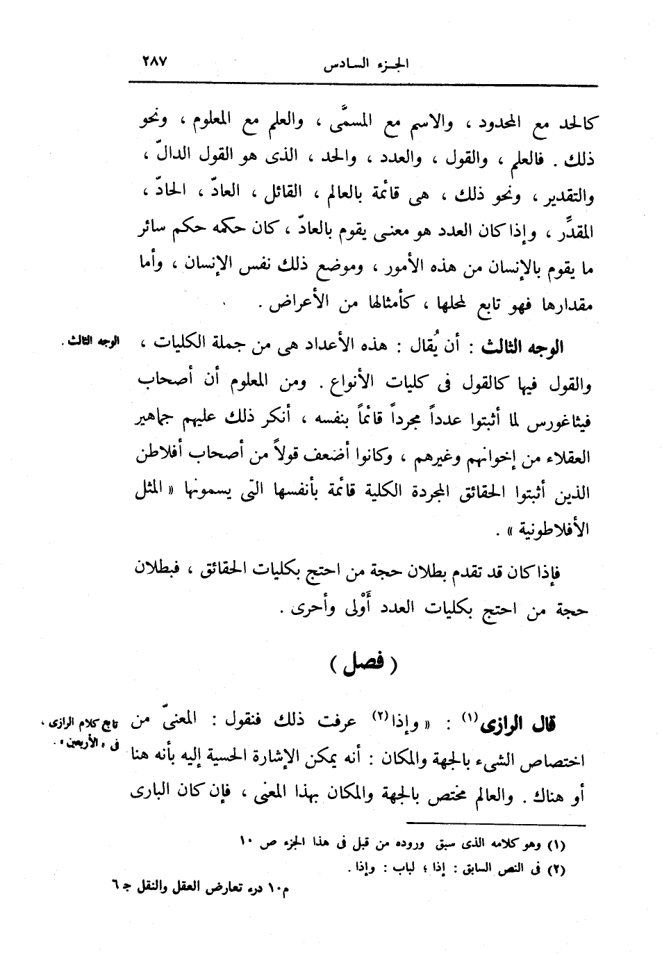 ومن المعلوم أن أصحاب فيثاغورس لما أثبتوا عدداً مجرداً قائماً بنفسه، أنكر ذلك عليهم جماهير العقلاء من إخوانهم وغيرهم، وكانوا أضعف قولاً من أصحاب أفلاطون الذي أثبتوا الحقائق المجردة الكلية قائمة بأنفسها التي يسمونها (المثل الأفلاطونية) .