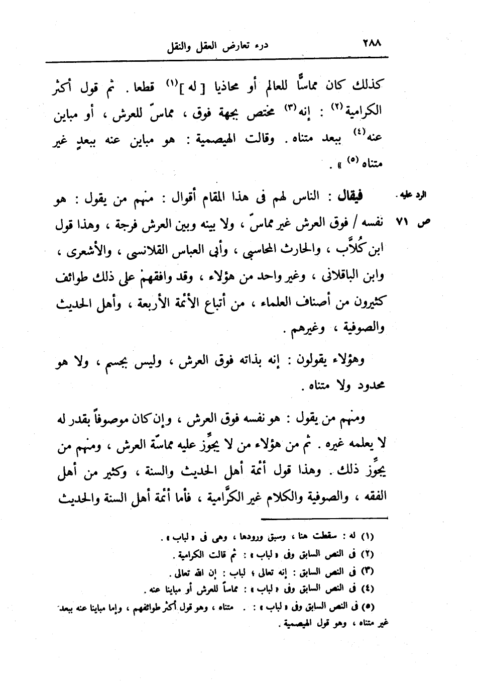 فيقال: الناس لهم في هذا المقام أقوال: منهم من يقول: هو نفسه فوق العرش غير مماس، ولا بينه وبين العرش فرجة، وهذا قول ابن كلاب، والحارث المحاسبي، وأبي العباس القلانسي، والأشعري، وابن الباقلاني، وغير واحد من هؤلاء، وقد وافقهم على ذلك طوائف كثيرة من أصناف العلماء، ومن أتباع الأئمة الأربعة، وأهل الحديث والصوفية، وغيرهم.