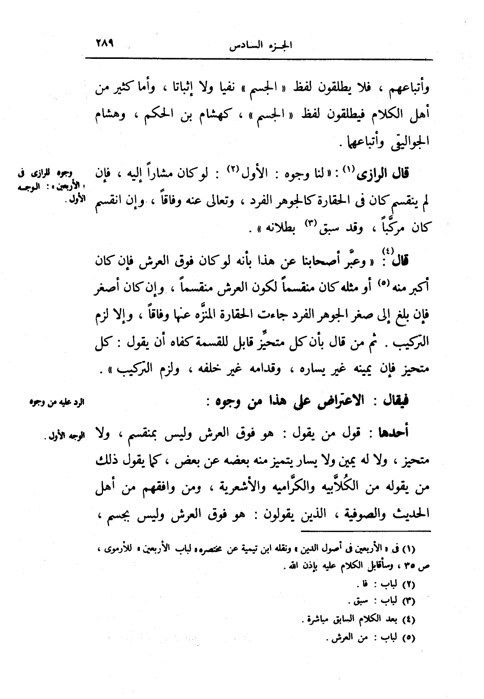 قال (وعبر أصحابنا عن هذا بأنه لو كان فوق العرش، فإن كان أكبر منه أو مثله كان منقسماً لكون العرش منقسماً، وإن كان أصغر فإن بلغ إلى صغر الجوهر الفرد جاءت الحقارة المنزه عنها وفاقاً، وإلا لزم التركيب.