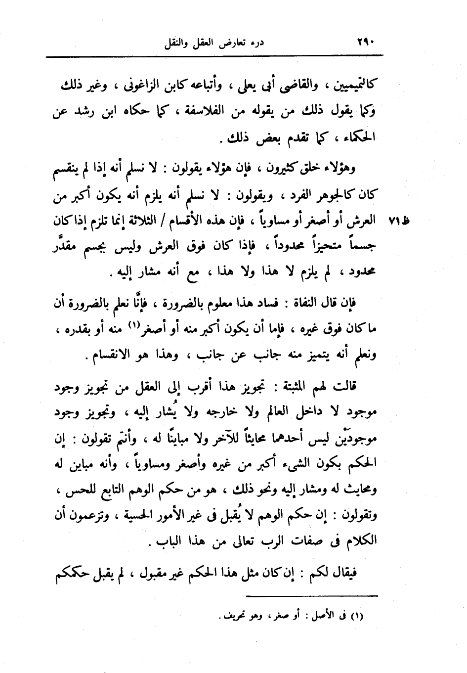 وهؤلاء خلق كثيرون فإن هؤلاء يقولون: لا نسلم أنه إذا لم ينقسم كان الجوهر الفرد، ويقولون: لا نسلم أنه يلزم أنه يكون أكبر من العرش أو أصغر أو مساوياً، فإن هذه الأقسام الثلاثة إنما تلزم إذا كان جسماً متحيزاً محدوداً، فإذا كان فوق العرش وليس بجسم مقدر محدود، لم يلزم لا هذا ولا هذا، مع أنه مشار إليه.
