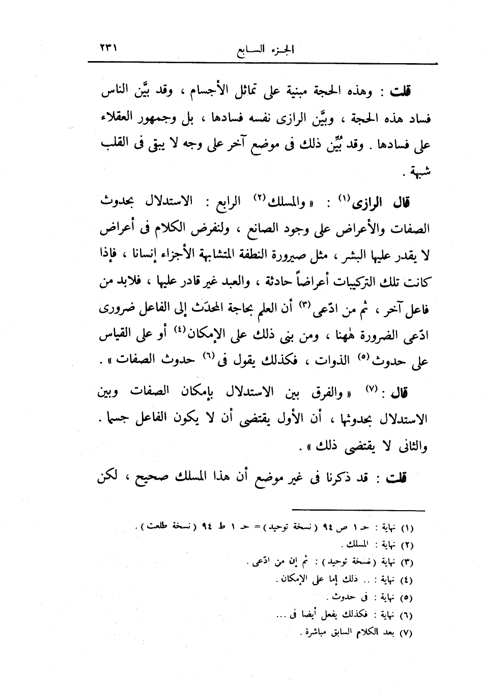 قال الرازي: (والمسلك الرابع: الاستدلال بحدوث الصفات والأعراض على وجود الصانع، ولنفرض الكلام في أعراض لا يقدر عليها بشر، مثل صيرورة النطفة المتشابهة الأجزاء أنساناً، فإذا كانت تلك التركيبات أعراضاً حادثة، والعبد غير قادر عليها، فلا بد من فاعل آخر، ثم من ادعى أن العلم بحاجة المحدث إلى الفاعل ضروري ادعى الضرورة ههنا، ومن بنى ذلك على الإمكان أو على القياس على حدوث الذوات، فكذلك يقول في حدوث الصفات) .