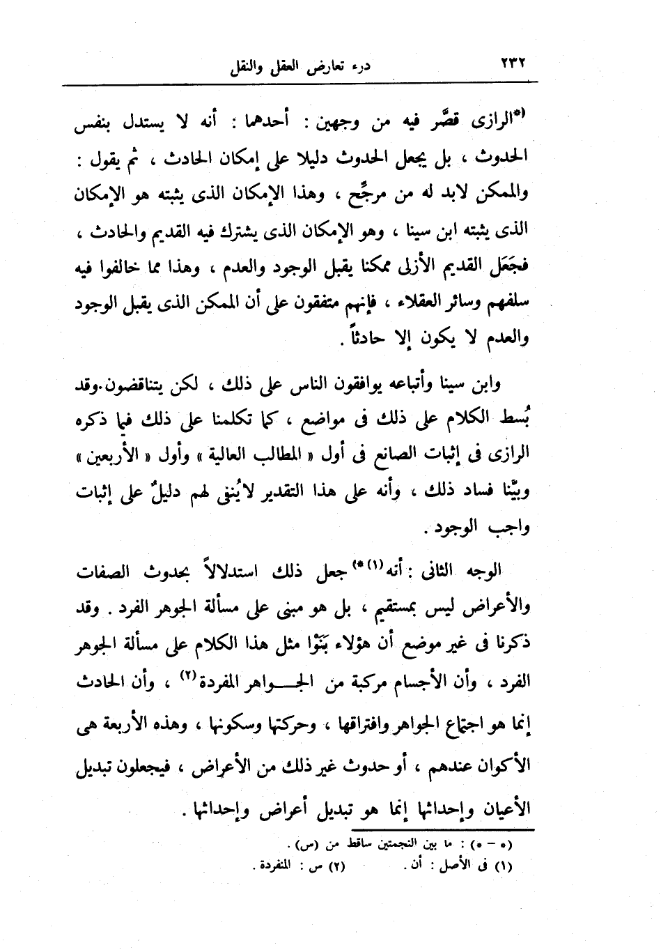 الرازي قصر فيه من وجهين: أحدهما: أنه لا يستدل بنفس الحدوث، بل يجعل الحدوث دليلاً على إمكان الحادث، ثم يقول: والممكن لا بد له من مرجح، وهذا الإمكان الذي يثبته هو الإمكان الذي يثبته ابن سينا، وهو الإمكان الذي يشترك فيه القديم والحادث، فجعل القديم الأزلي ممكناً يقبل الوجود والعدم، وهذا مما خالفوا فيه سلفهم وسائر العقلاء، فإنهم متفقون على أن الممكن الذي يقبل الوجود والعدم لا يكون إلا حادثاً.
