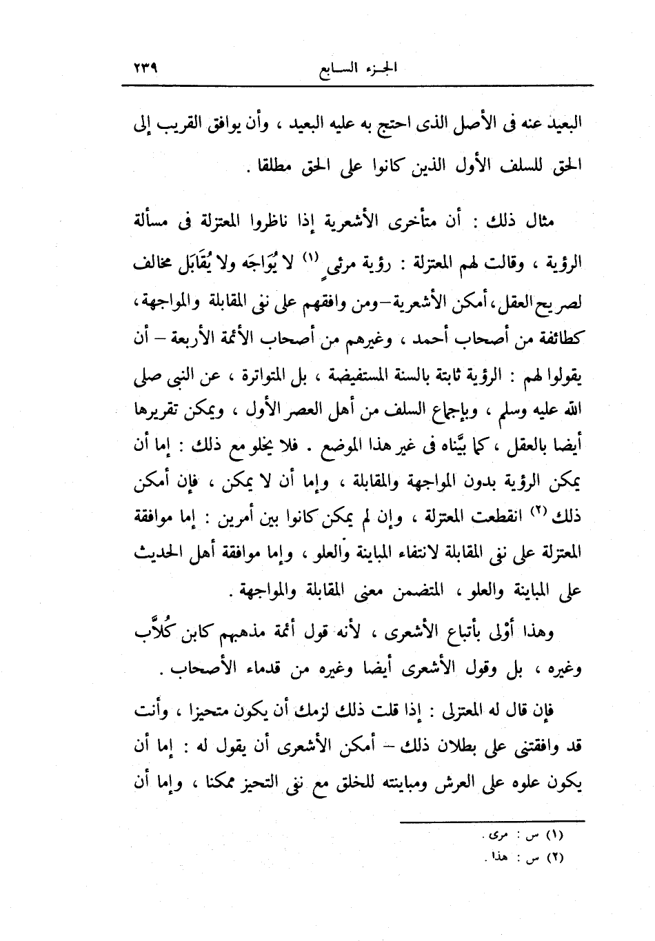 فلا يخلو من ذلك: إما أن يمكن الرؤية بدون المواجهة والمقابلة، وإما أن لا يمكن، فإن أمكن ذلك انقطعت المعتزلة، وإن لم يمكن كانوا بين أمرين: إما موافقة المعتزلة على نفي المقابلة لانتفاء المباينة والعلو، وإما موافقة أهل الحديث على المباينة والعلو، المتضمن معنى المقابلة والمواجهة.