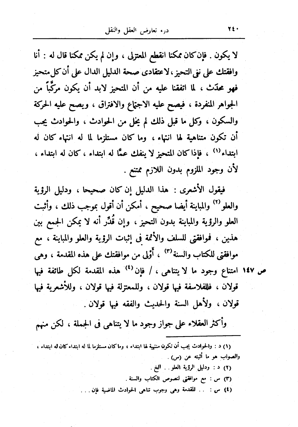 فيقول الأشعري: هذا الدليل إن كان صحيحاً، ودليل الرؤية والعلو والمباينة أيضاً صحيح، أمكن أن أقول بموجب ذلك، وأثبت العلو والرؤية والمباينة بدون التحيز، وإن قدر أنه لا يمكن الجمع بين هذين، فموافقتي للسلف والأئمة في إثبات الرؤية والعلو والمباينة، مع موافقتي للكتاب والسنة، أولى من موافقتك على هذه المقدمة، وهي امتناع وجود ما لا يتناهى، فإن هذه المقدمة لكل طائفة فيها قولان، فللفلاسفة فيها قولان، وللمعتزلة فيها قولان، وللأشعرية فيها قولان، ولأهل السنة والحديث والفقه فيها قولان.