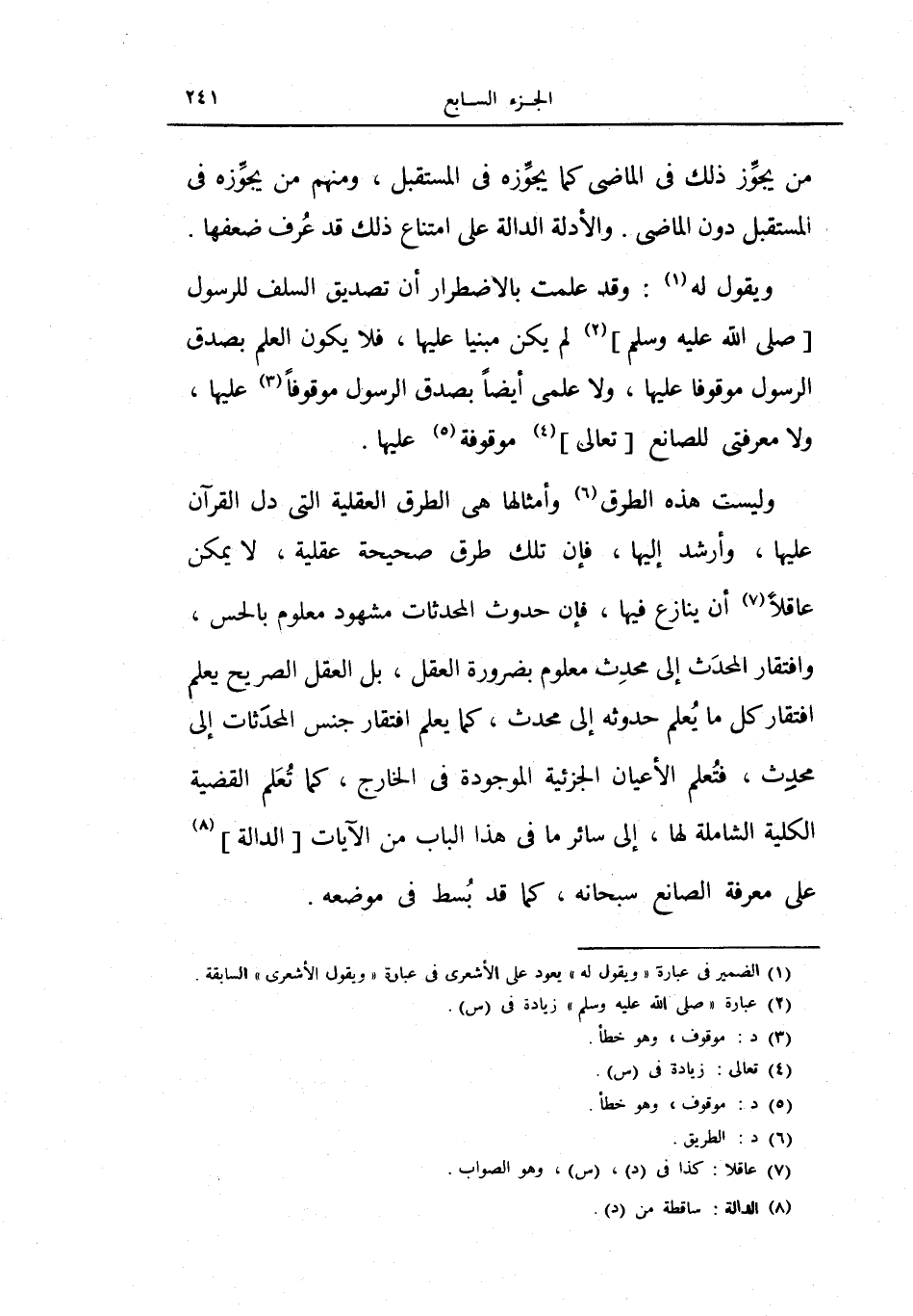 ويقول له: وقد علمت بالاضطرار أن تصديق السلف للرسول صلى الله عليه وسلم لم يكن مبنياً عليها، فلا يكون العلم بصدق الرسول موقوفاً عليها، ولا علمي أيضاً بصدق الرسول موقوفاً عليها، ولا معرفتي للصانع تعالى موقوفة عليها.