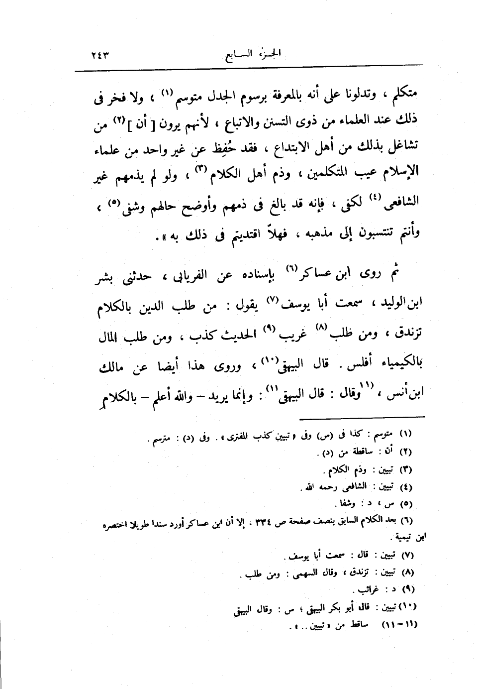 متكلم، وتدلونا على أنه بالمعرفة برسوم الجدل متوسم، ولا فخر في ذلك عند العلماء من ذوي التسنن والاتباع، لأنهم يرون أن من تشاغل بذلك من أهل الابتداع، فقد حفظ عن غير واحد من علماء الإسلام عيب المتكلمين، وذم أهل الكلام، ولو لم يذمهم غير الشافعي لكفى، فإنه قد بالغ في ذمهم وأوضح حالهم وشفى، وأنتم تنتسبون إلى مذاهبه، فهلا اقتديتم في ذلك به) .