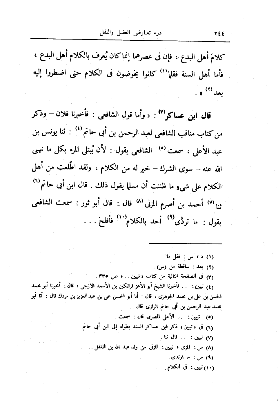قال ابن عساكر: (وأما قول الشافعي: فأخبرنا فلان - وذكر من كتاب مناقب الشافعي لـ عبد الرحمن بن أبي حاتم: ثنا يونس بن عبد الأعلى، سمعت الشافعي يقول: لأن يبتلي المرء بكل ما نهى الله عنه - سوى الشرك - خير له من الكلام، ولقد اطلعت من أهل الكلام على شيء ما ظننت أن مسلما يقول ذلك.