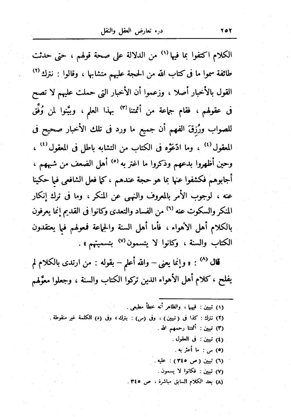 أجابوهم فكشفوا عنها بما هو حجة عندهم، كما فعل الشافعي فيما حكينا عنه، لوجوب الأمر بالمعروف والنهي عن المنكر، وما في ترك أنكار المنكر والسكوت عنه من الفساد والتعدي وكانوا في القديم إنما يعرفون بالكلام أهل الأهواء، فأما أهل السنة والجماعة فمعولهم فيما يعتقدون الكتاب والسنة، وكانوا لا يتسمون بتسميتهم) .