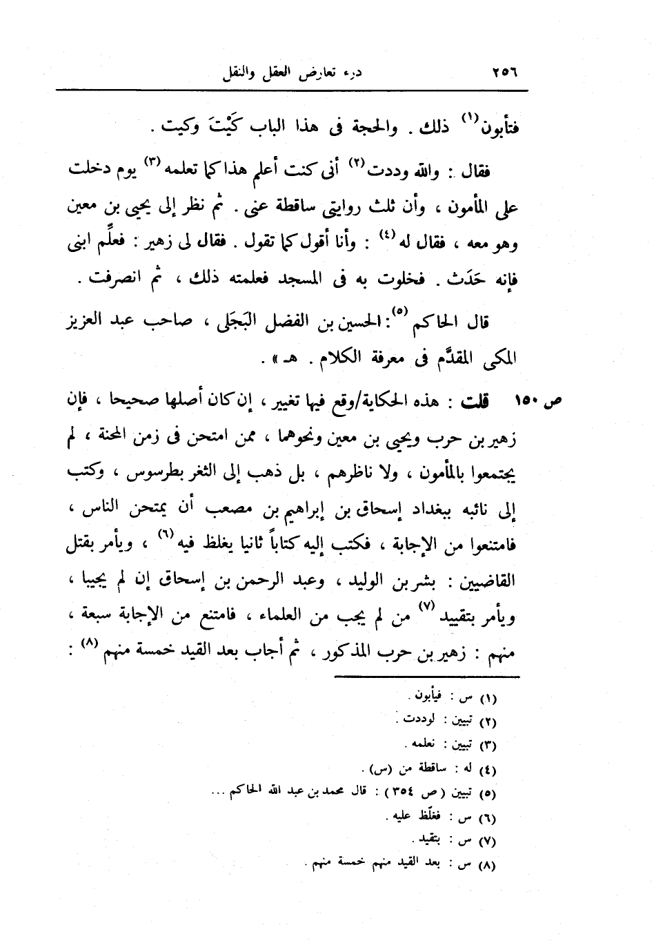 قلت: هذه الحكاية وقع فيها تغيير، أن كان أصلها صحيحاً، فإن زهير بن حرب ويحيى بن معين ونحوهما، ممن امتحن في زمن المحنة، لم يجتمعوا بالمأمون، ولا ناظرهم، بل ذهب إلى الثغر بطرسوس، وكتب إلى نائبه ببغداد إسحاق بن أبراهيم ين مصعب أن يمتحن الناس، فامتنعوا من الإجابة، فكتب إليه كتاباً ثانياً يغلظ فيه، ويأمر بقتل القاضيين: بشر بن الوليد، وعبد الرحمن بن إسحاق إن لم يجيبا، ويأمر بتقييد من لم يجب من العلماء، فامتنع من الإجابة سبعة، منهم: