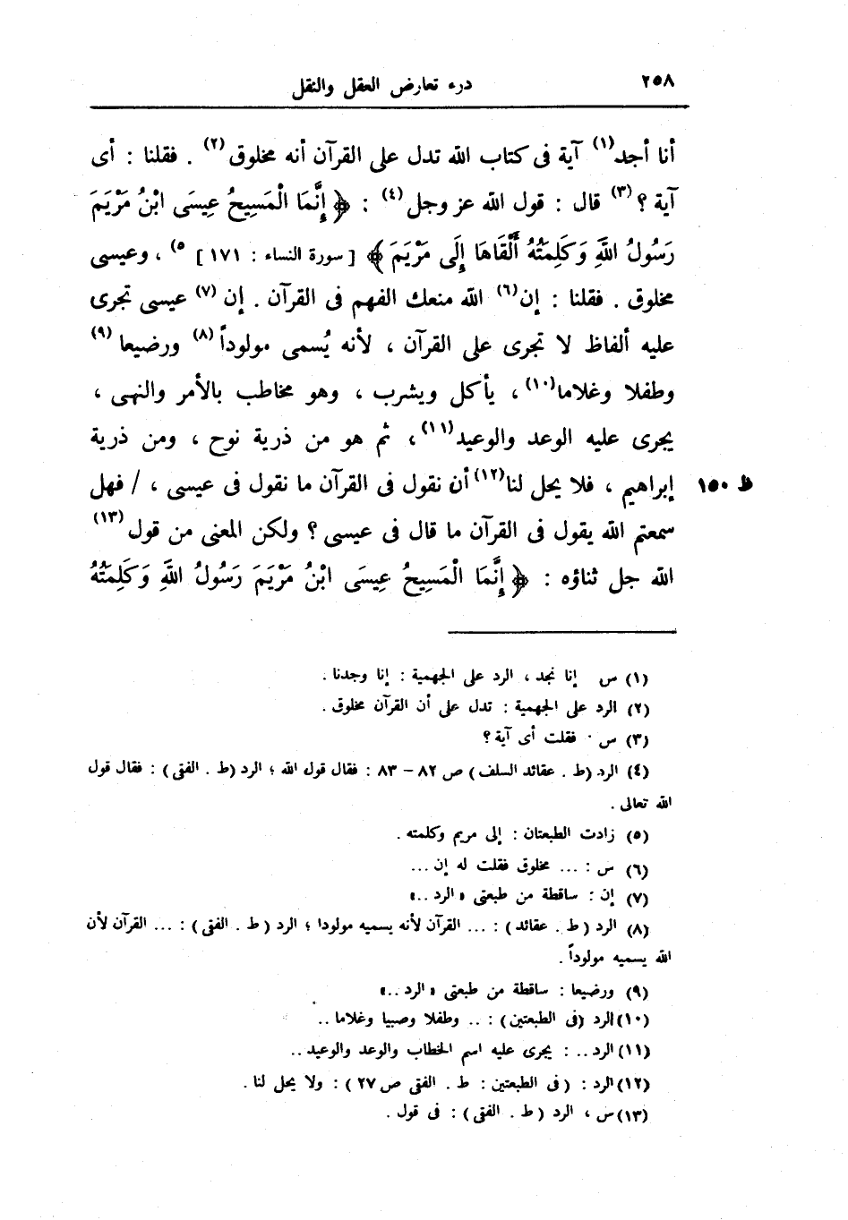 فقلنا: إن الله منعك الفهم في القرآن: إن عيسى تجري عليه ألفاظ لا تجري على القرآن، لأنه يسمى مولوداً رضيعاً وطفلاً وغلاماً، يأكل ويشرب، وهو مخاطب بالأمر والنهي، يجري عليه الوعد والوعيد، ثم هو من ذرية نوح، ومن ذرية إبراهيم، فلا يحل لنا أن نقول في القرآن ما نقول في عيسى، فهل سمعتم الله يقول في القرآن ما قال في عيسى؟ ولكن المعنى من قول الله جل ثناؤه: {إنما المسيح عيسى ابن مريم رسول الله وكلمته
