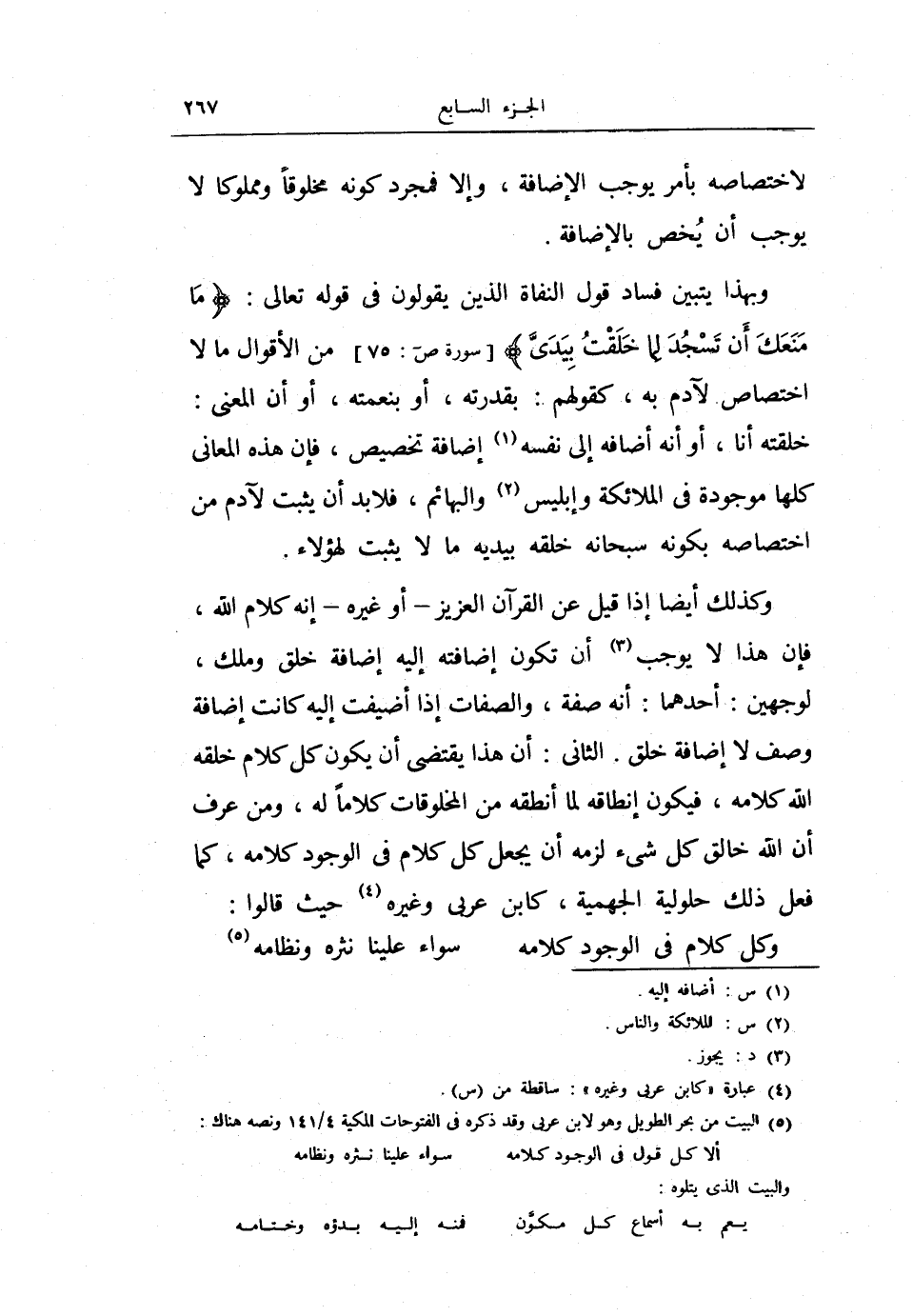 وكذلك أيضا إذا قيل عن القرآن العزيز - أو غيره - إنه كلام الله، فإن هذا لا يوجب أن تكون إضافته إليه إضافة خلق وملك، لوجهين: أحدهما: أنه صفة، والصفات إذا أضيفت إليه كانت إضافة وصف لا إضافة خلق.