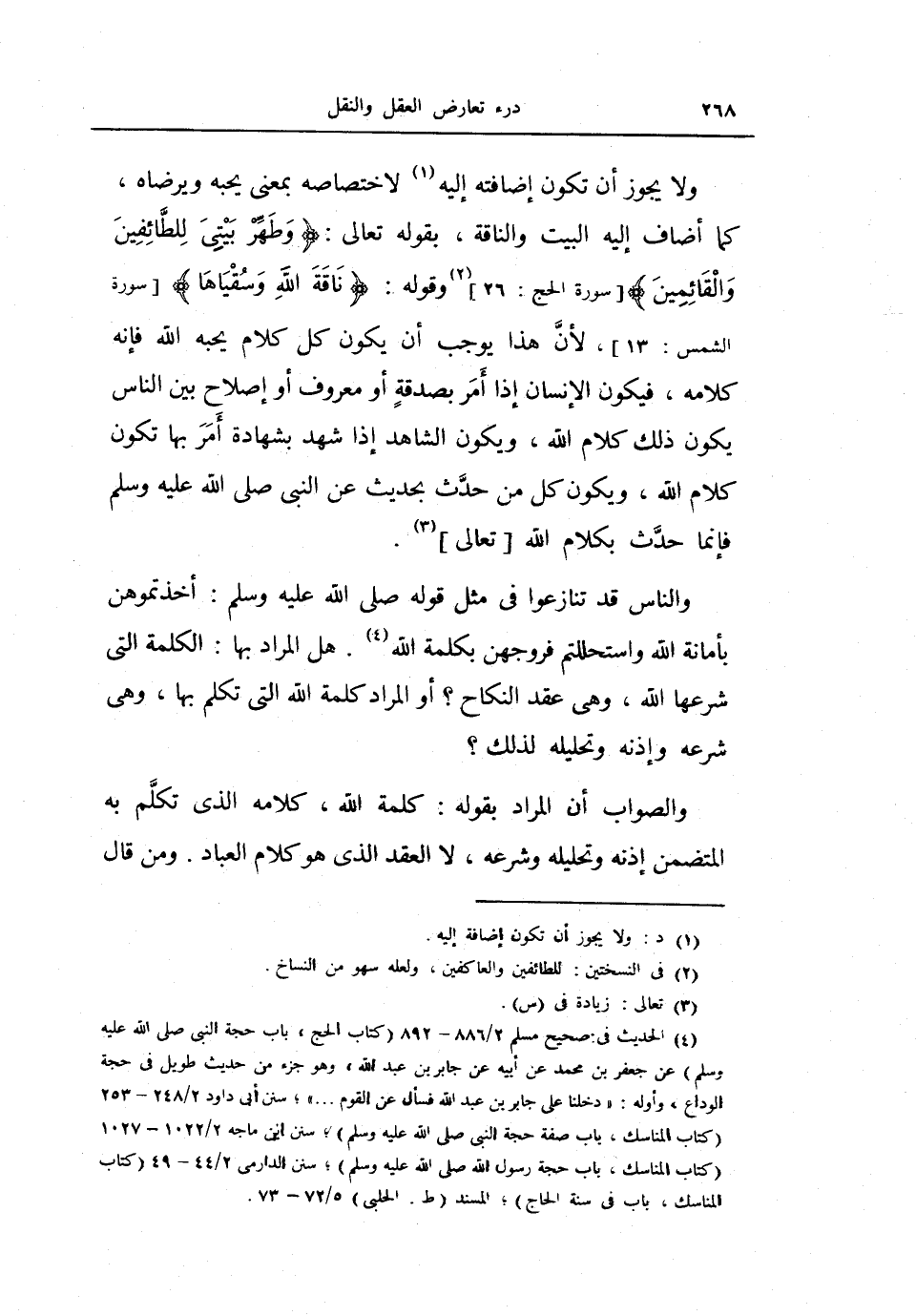 ولا يجوز أن تكون إضافته إليه لا ختصاصه بمعنى يحبه ويرضاه، كما أضاف إليه البيت والناقة، بقوله تعالى: {وطهر بيتي للطائفين والقائمين} ، وقوله: {ناقة الله وسقياها} ، لأن هذا يوجب أن يكون كل كلام يحبه الله فإنه كلامه، فيكون الإنسان إذا أمر بصدقة أو معروف أو إصلاح بين الناس يكون ذلك كلام الله، ويكون الشاهد إذا شهد بشهادة أمر بها تكون كلام الله، ويكون كل من حدث بحديث عن النبي صلى الله عليه وسلم فإنما حدث بكلام الله تعالى.