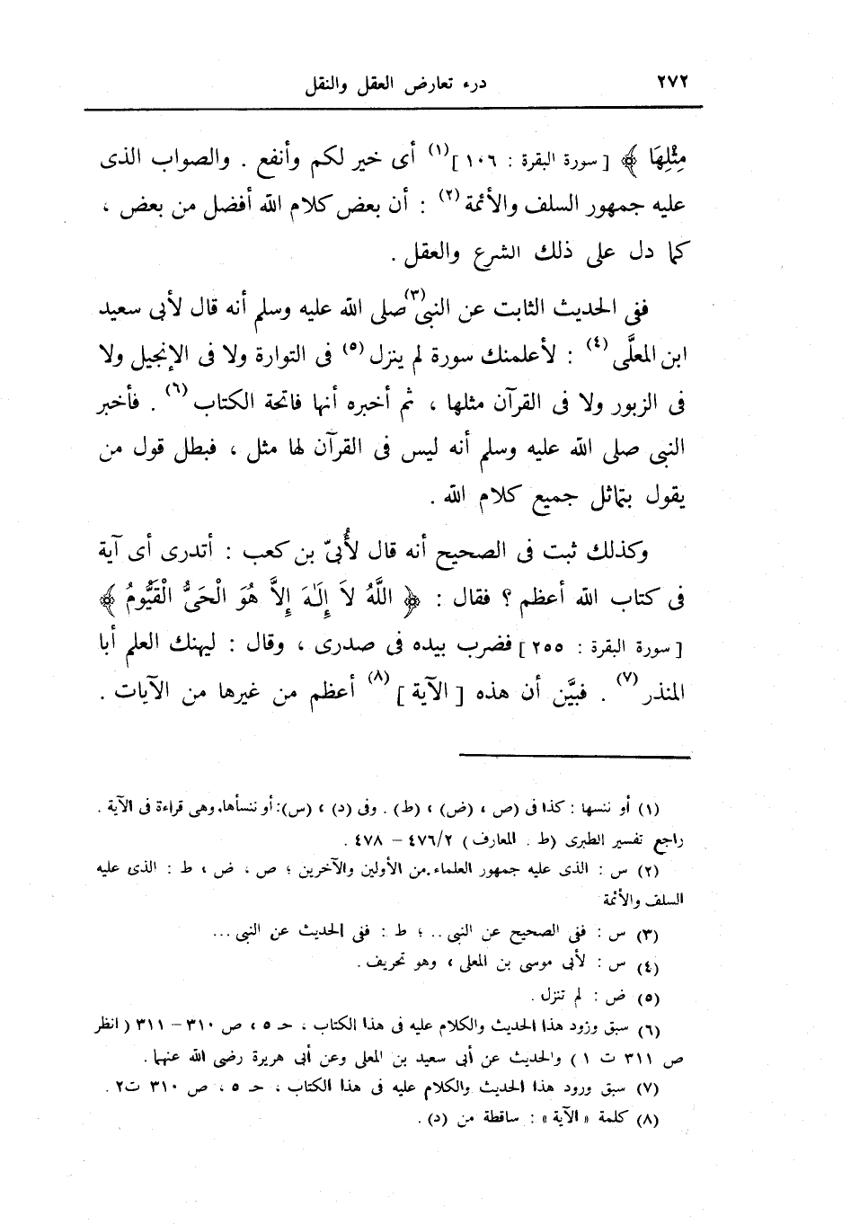 ففي الحديث الثابت «عن النبي صلى الله عليه وسلم أنه قال لأبي سعيد بن المعلى: لأعلمنك سورة لم ينزل في التوراة ولا في الإنجيل ولا في الزبور ولا في القرآن مثلها» ، ثم أخبره أنها فاتحة الكتاب، فأخبر النبي صلى الله عليه وسلم فأخبر النبي صلى الله عليه وسلم أنه ليس في القرآن لها مثل، فبطل قول من يقول بتماثل جميع كلام الله.